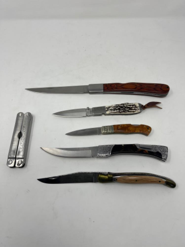Lot # 132 - 5 Knife 1 Leatherman Lot Starting Bid: $ 5.00 Bids: This sale will end in: |