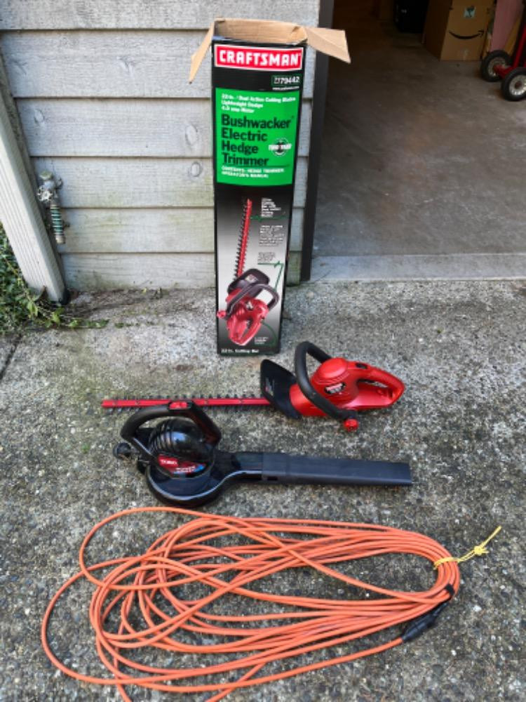 Lot # 6 - Craftsman Hedge Trimmer, Blower, Extension Cord Starting Bid: $ 5.00 Bids: This sale will end in: |