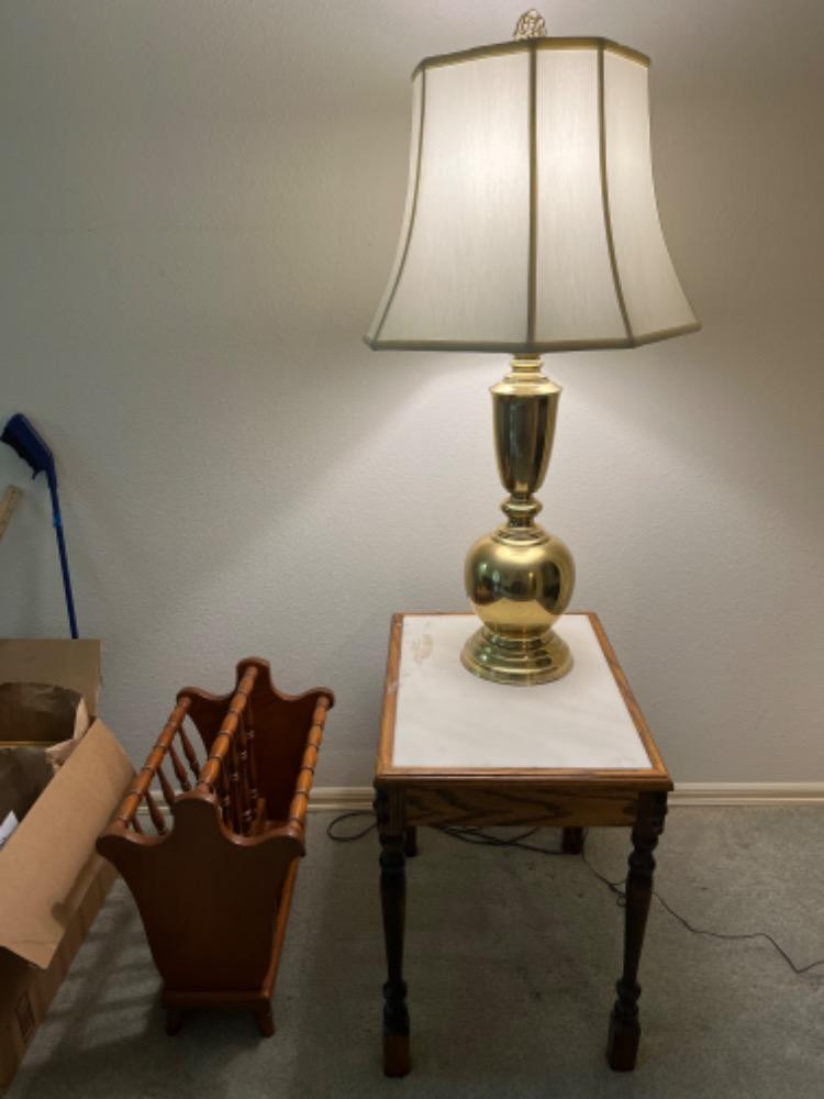 Lot # 34 - Wood and Marble End Table, Lamp and Magazine Rack Starting Bid: $ 5.00 Bids: This sale will end in: |