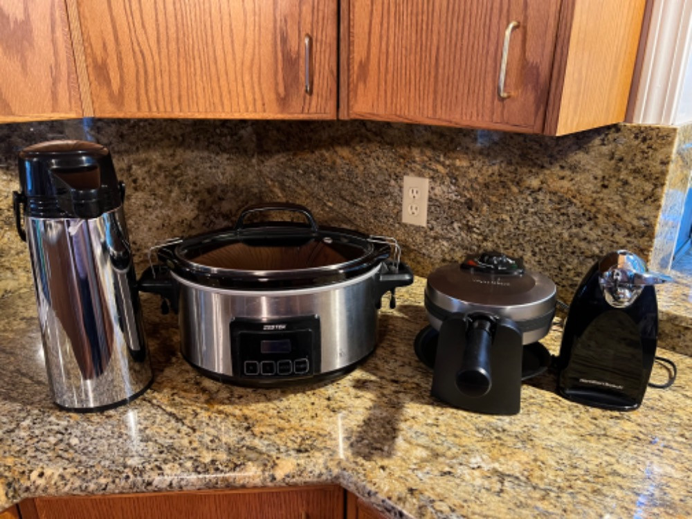Lot # 68 - Crock Pot, Waffle Maker, Electric Can opener, & Coffee Carafe Starting Bid: $ 5.00 Bids: This sale will end in: |