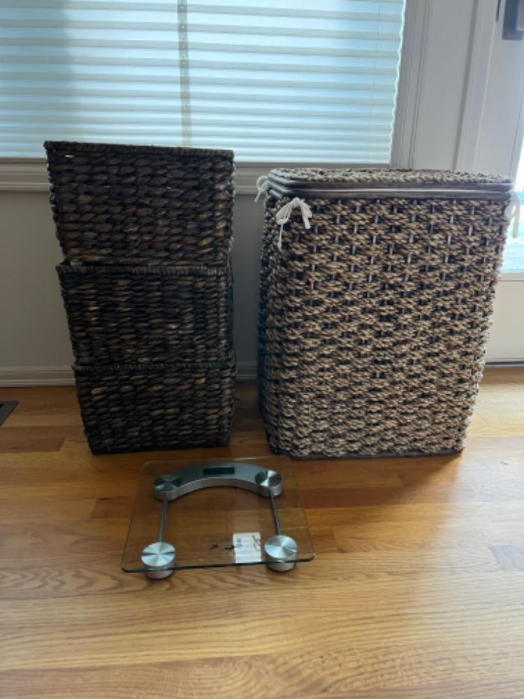 Lot # 79 - Wicker Hamper, 3 Wicker Storage Baskets, Scale Starting Bid: $ 5.00 Bids: This sale will end in: |