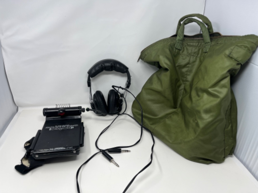 Lot # 86 - Vintage Flying Helmet Bag, Air 680 Headphones , Pilots Clipboard Starting Bid: $ 5.00 Bids: This sale will end in: |