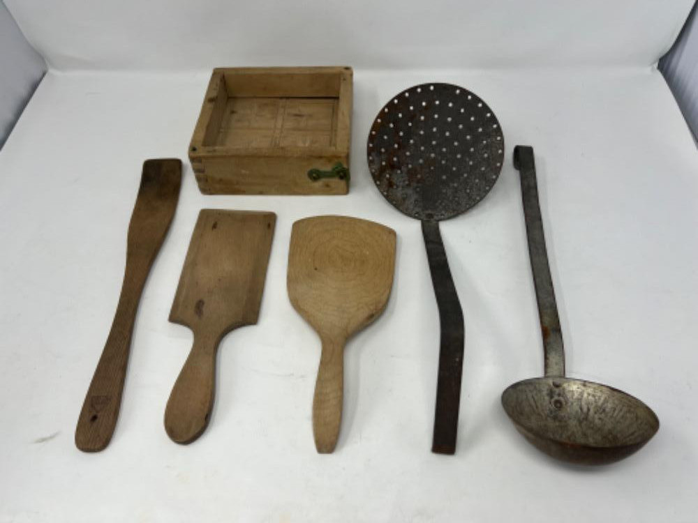 Lot # 12 - Antique Wood Butter Mold and Utensils Starting Bid: $ 5.00 Bids: This sale will end in: |