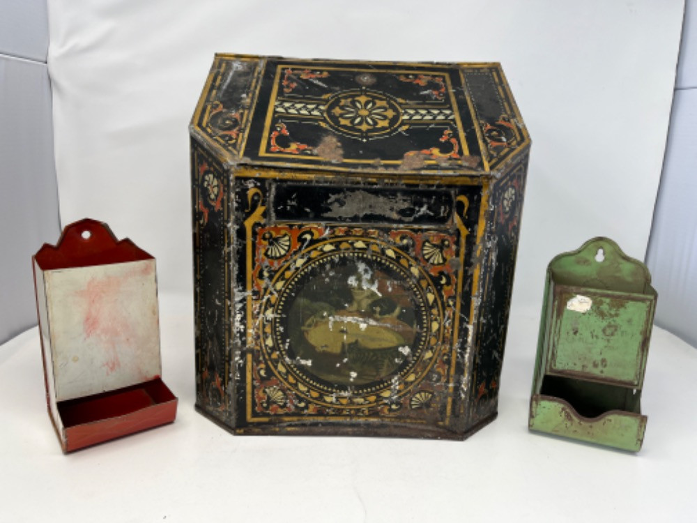 Lot # 119 - Large Antique Tea Tin and Match Holders Starting Bid: $ 5.00 Bids: This sale will end in: |