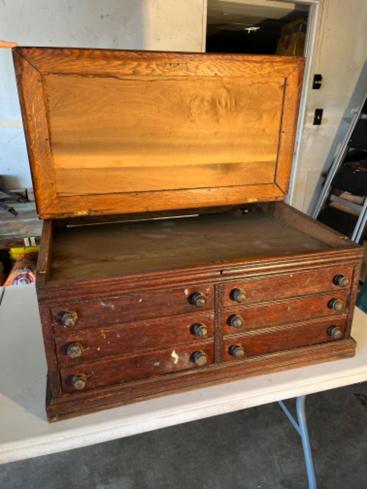 Lot # 1 - Antique 6 Drawer Flip Top Spool Cabinet Starting Bid: $ 5.00 Bids: This sale will end in: |