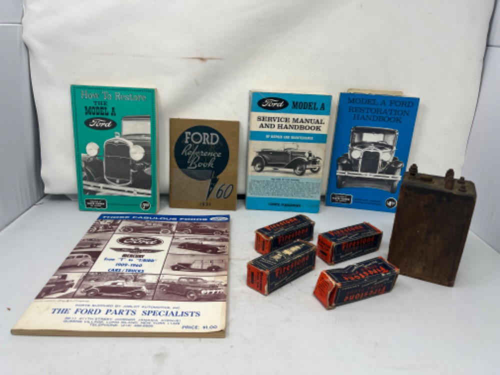Automotive: Ford Model A Literature Dating to 1937, Awesome Ford Branded T Coil, and Vintage Firestone Spark Plugs in Original Packaging With Original Product!