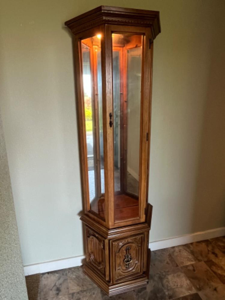 Lot # 5 - Vintage Oak Corner Curio Cabinet Starting Bid: $ 5.00 Bids: This sale will end in: |