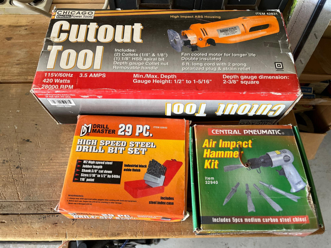 Lot # 249 - Cutout Tool, Drill Bit Set, Air Impact Hammer Kit Starting Bid: $ 5.00 Bids: This sale will end in: |
