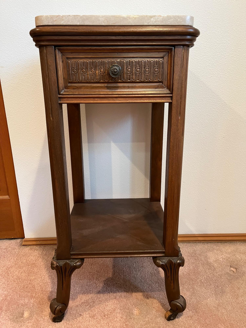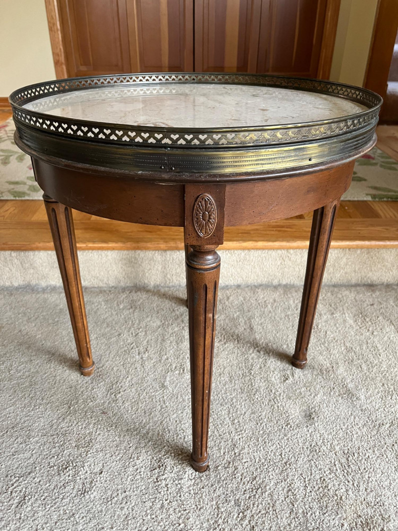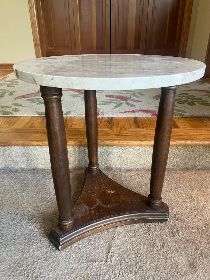Lot # 6 - Mahogany/Marble Table Starting Bid: $ 5.00 Bids: This sale will end in: |