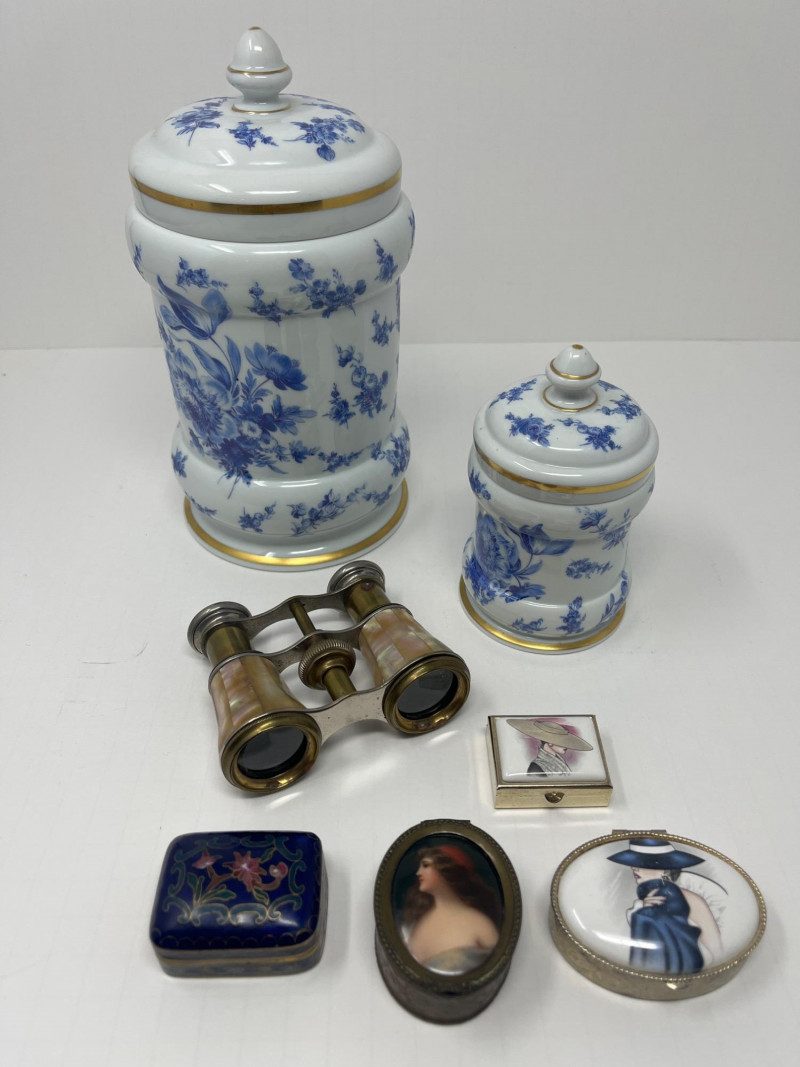 Lot # 24 - MOP Opera Glasses, Ginger Jars, Trinket Boxes Starting Bid: $ 5.00 Bids: This sale will end in: |