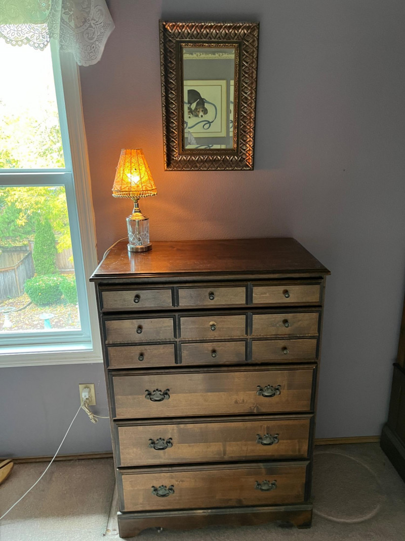 Lot # 160 - Solid Wood Dresser, Lamp, Ornate Mirror Starting Bid: $ 5.00 Bids: This sale will end in: |