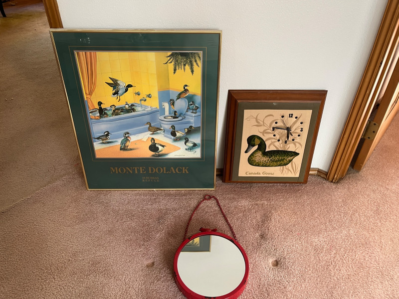 Lot # 166 - Goose Clock, Duck Print, Bird Mirror Starting Bid: $ 5.00 Bids: This sale will end in: |