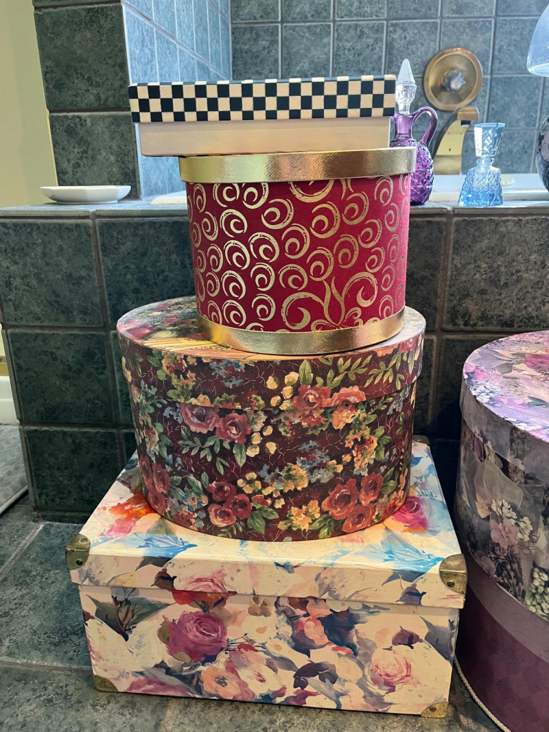 Lot # 187 - Decorative Hat Boxes Plus Colored Glass Cruets Starting Bid: $ 5.00 Bids: This sale will end in: |