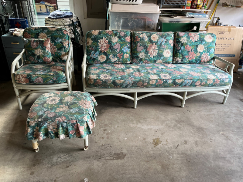 Lot # 198 - Vintage Rattan Style Couch, Chair, And Footrest Starting Bid: $ 5.00 Bids: This sale will end in: |