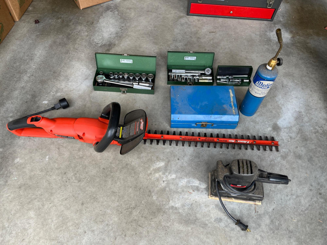 Lot # 202 - S-K Socket Sets, Hedge Trimmer, Sander, Torch Lot Starting Bid: $ 5.00 Bids: This sale will end in: |