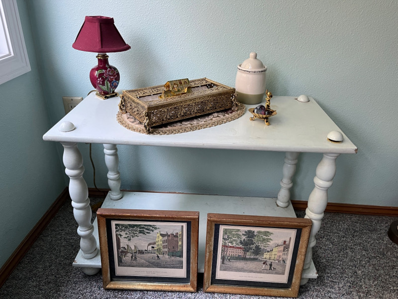 Lot # 205 - White 2 Tier Shelf + Misc. Decor Starting Bid: $ 5.00 Bids: This sale will end in: |