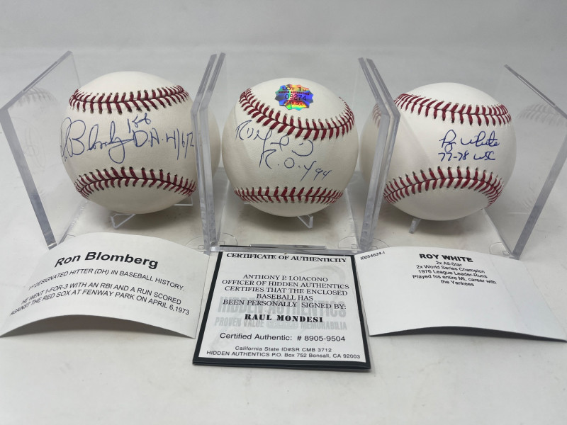 Lot # 234 - Raul Mondesi, Ron Blomberg, Roy White Signed Baseballs Starting Bid: $ 10.00 Bids: This sale will end in: |