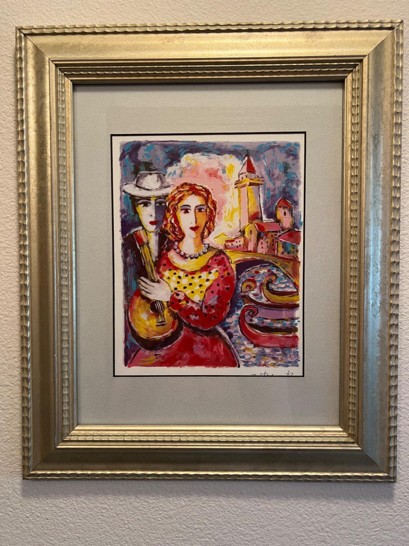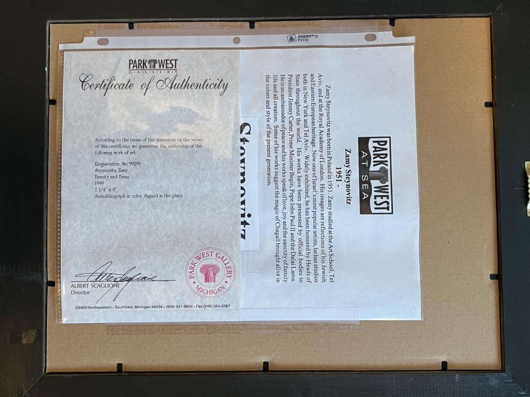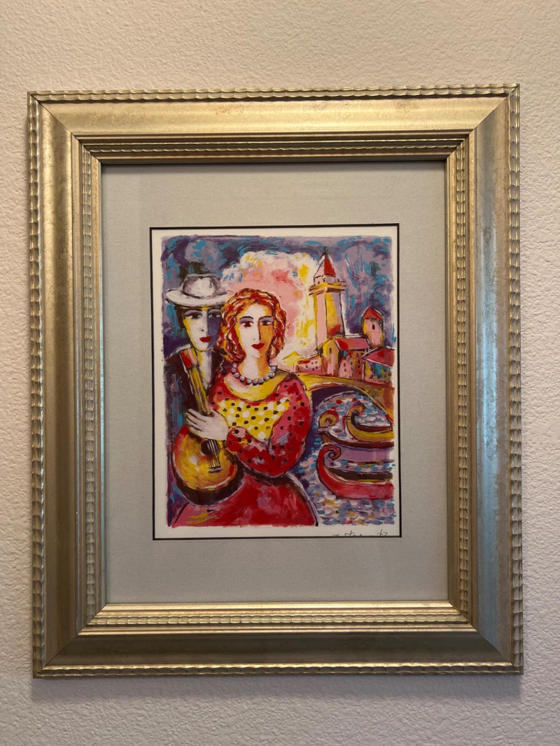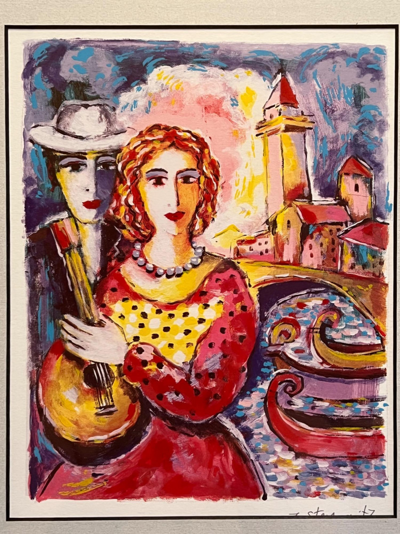 "Beauty and Beau" Seriolithograph in Color by Zamy Steynovitz Signed in the plate Frame dimensions 15 x 18” About the Artist: Zamy Steynovitz (1951–2000) was a Polish-born Israeli artist renowned for his modernist, abstract paintings that reflect his Jewish and Eastern European heritage. Born in Liegnitz, Poland, he immigrated to Israel in 1957. Steynovitz studied at the Art School in Tel Aviv and the Royal Academy of Arts in London. Much of the evolution in his work was related to his use of color and texture, with brighter and more vivid hues and contrasts. Sadly, he passed away at a young age in September 2000, leaving behind a prodigious body of work that is extremely collectible and sought after worldwide. **Item Eligible For Shipping**
