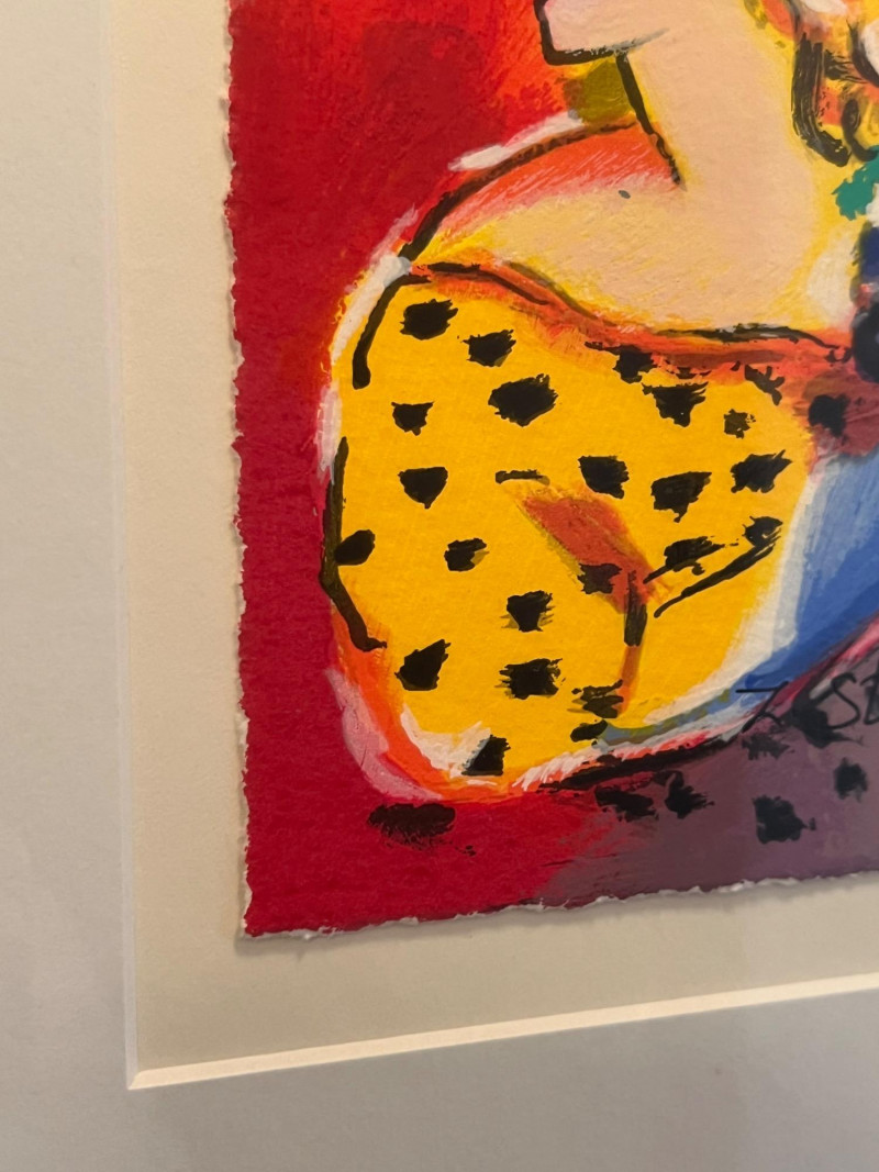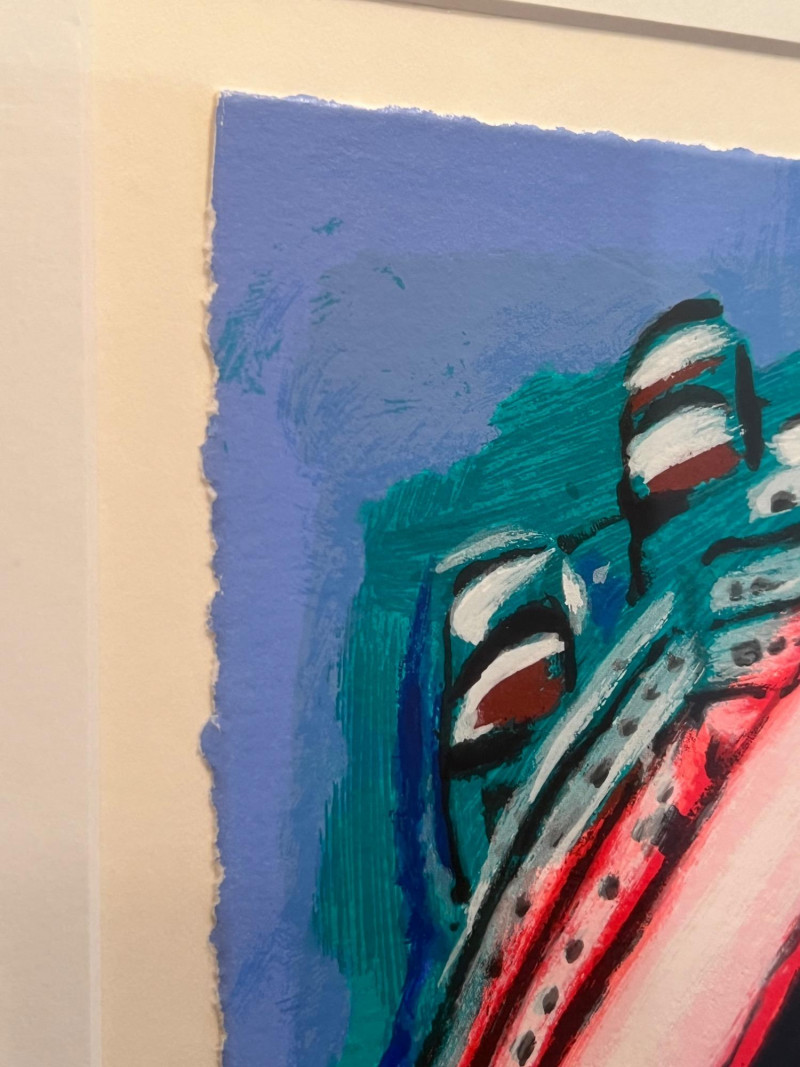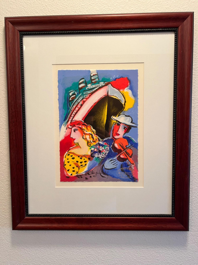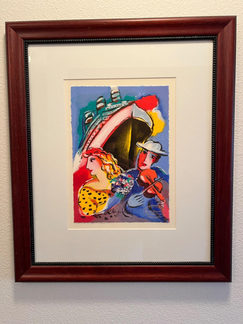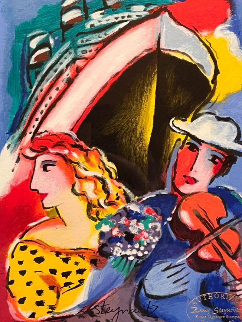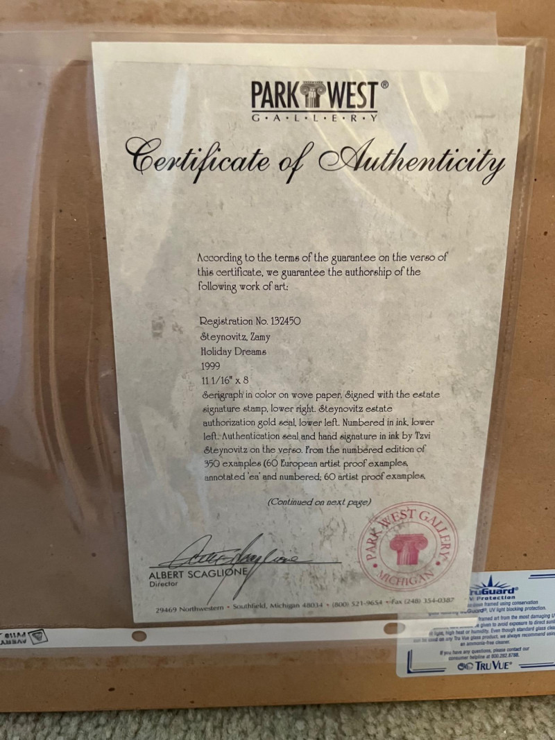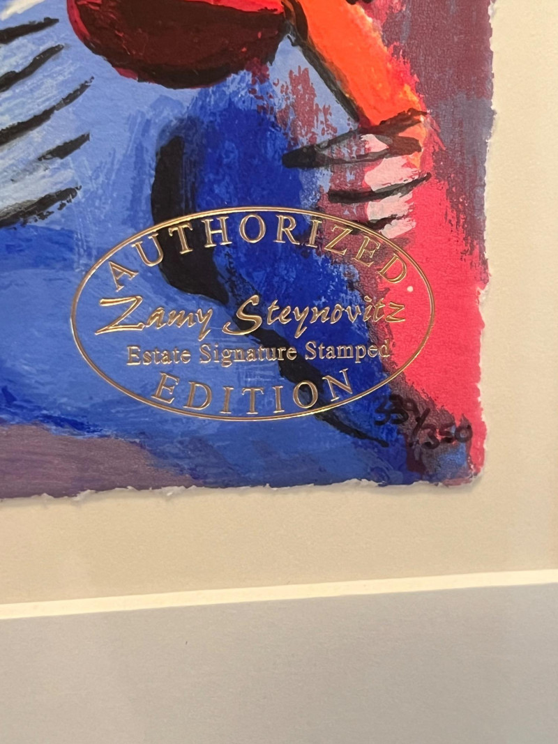 "Holiday Dreams" by Zamy Steynovitz Serigraph in color on wove paper 339/350 Signed with the estate signature stamp, lower right. Steynovitz estate authorization gold seal lower left. Numbered in ink lower left. Frame dimensions 18x21" About the Artist: Zamy Steynovitz (1951–2000) was a Polish-born Israeli artist renowned for his modernist, abstract paintings that reflect his Jewish and Eastern European heritage. Born in Liegnitz, Poland, he immigrated to Israel in 1957. Steynovitz studied at the Art School in Tel Aviv and the Royal Academy of Arts in London. Much of the evolution in his work was related to his use of color and texture, with brighter and more vivid hues and contrasts. Sadly, he passed away at a young age in September 2000, leaving behind a prodigious body of work that is extremely collectible and sought after worldwide. **Item Eligible For Shipping**