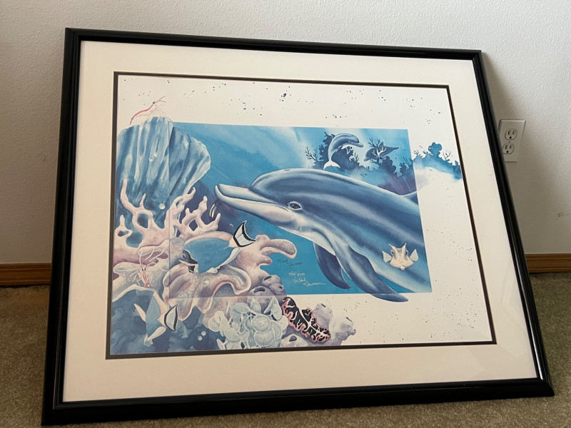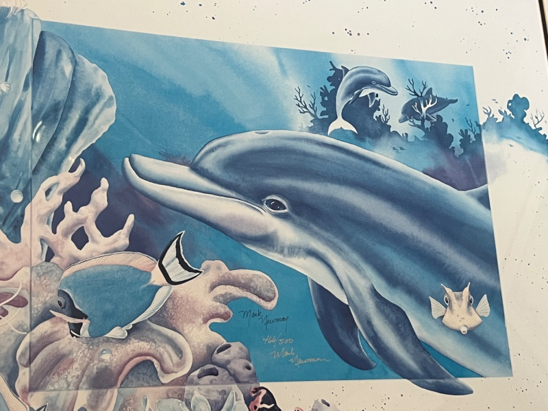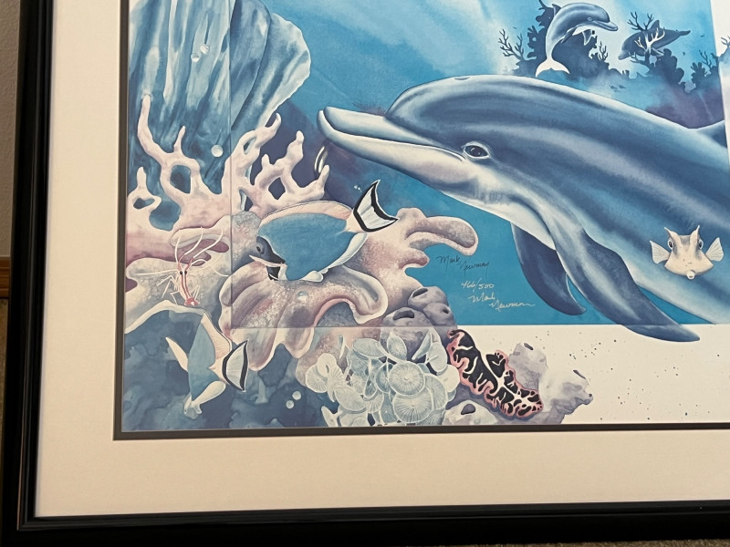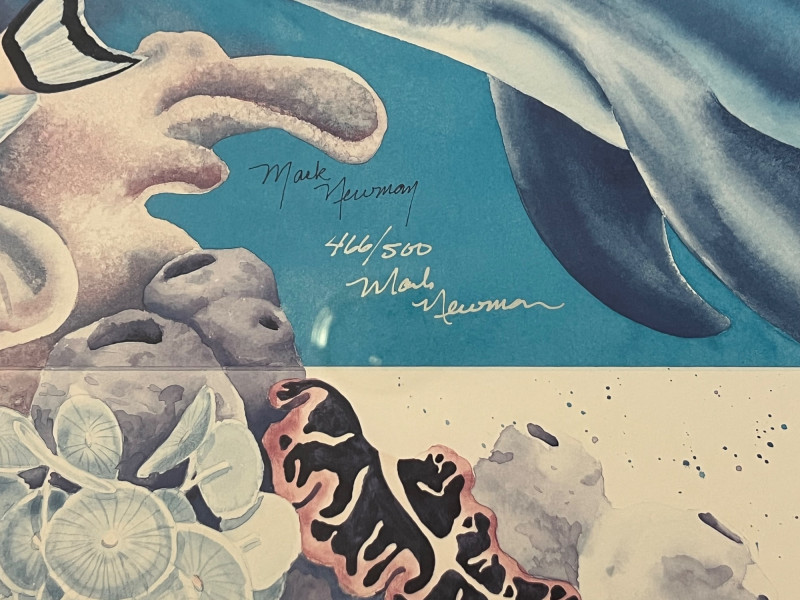"When Your Smiling" Limited Edition Lithograph by Mark Newman 466/500 Frame Dimensions 38 x 32” About the Artist: Born in 1953 in Michigan, Mark Newman moved to New York in 1982, where he lived for ten years before moving to Atlanta in 1992. There he met his wife, Stephanie, who was an artist at the time. She played an important role in Mark’s development and decision to become an artist. After discovering Mark’s talent in 1994, she convinced him to experiment with painting. With much encouragement and receiving a gift of his first watercolor palette, Mark began to develop his own style of painting. Completely self-taught, Mark had a tendency to paint very brightly. His discovery of marine tropical fish as a subject perfectly fit with his imagination and artistic approach and now they are his passion.
