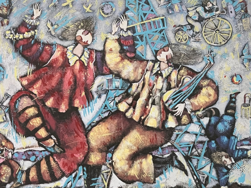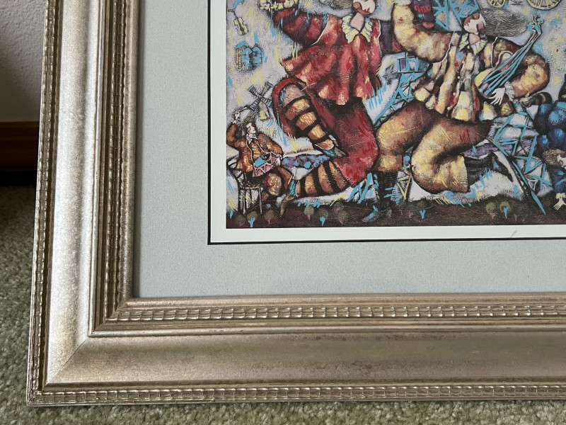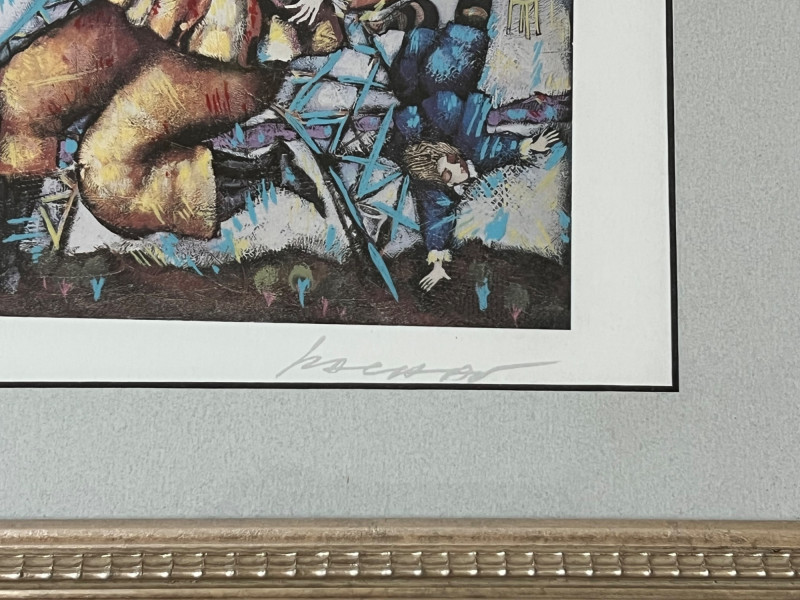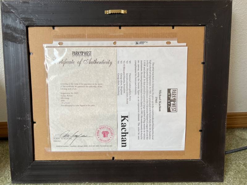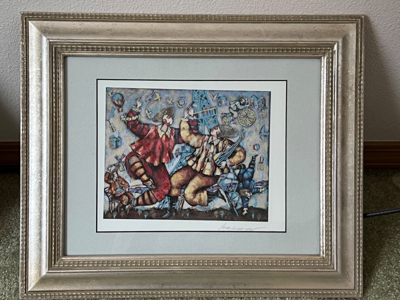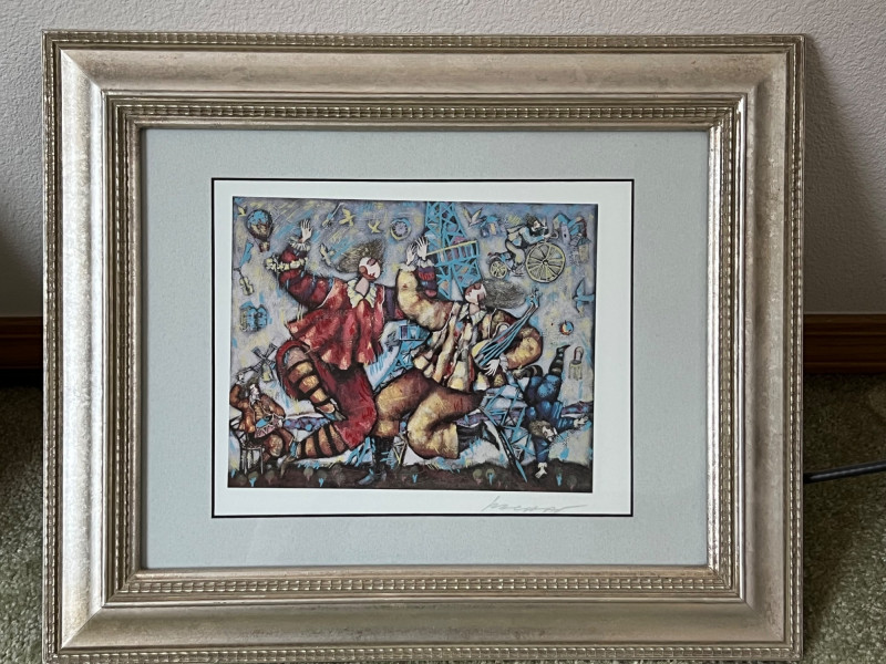 “Eiffel Song” Michael Kachan 1999 Seriograph in color. Signed in the plate. Frame Dimensions 18 x 15” About the Artist: A playful and festive atmosphere characterizes his works. His colors are vibrant and celebratory and his subjects are primarily centered on musicians, lovers, and dreamers, suggesting the influences of the 20th century master, Marc Chagall and the Bolivian naïve artist, Rodo Graciela Boulanger. He works mostly in acrylic on canvas, building up the surface with deep sculpted textures and overlays of pigments. He interprets his paintings into original serigraphs and hand-embellished serigraphs on canvas with a similar textural effect and achieves a luminosity of color through a combination of varnished inks and glazes. **Shipping Available**