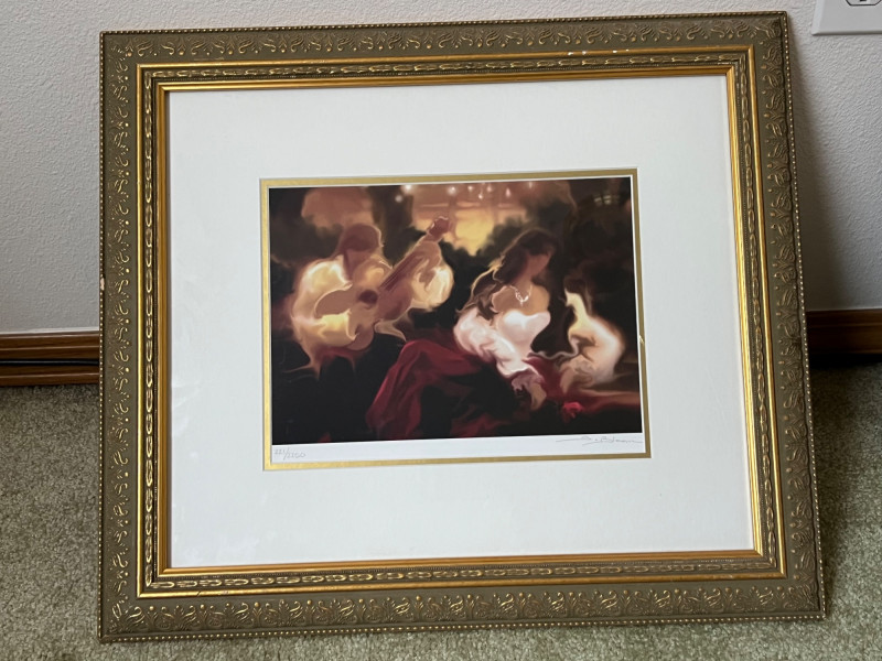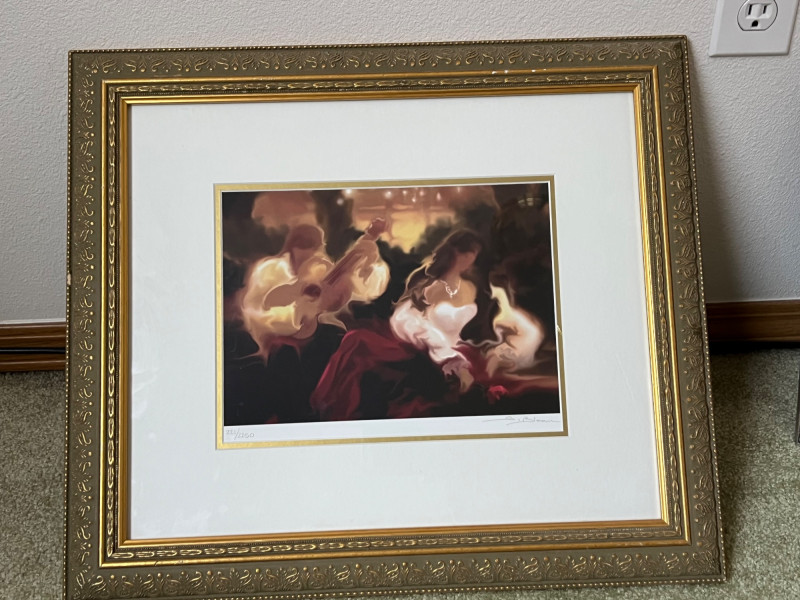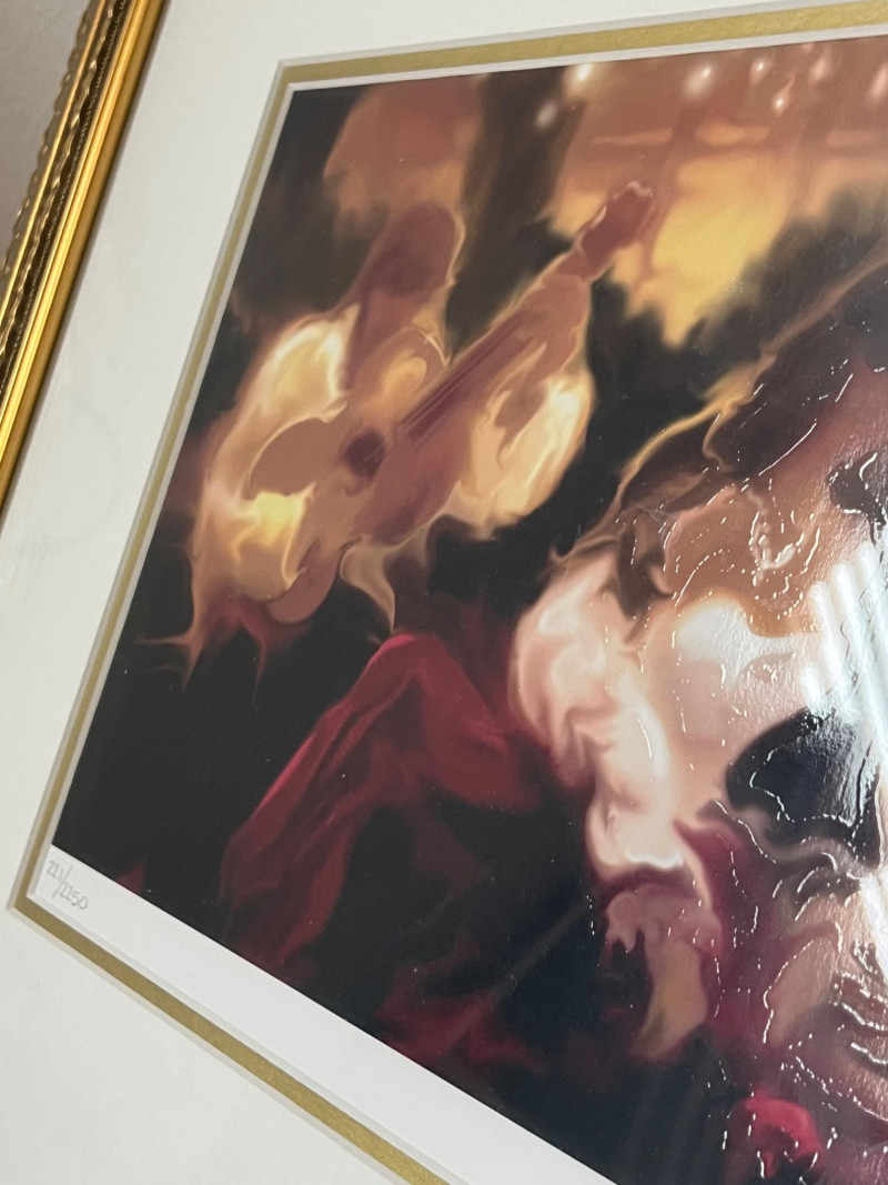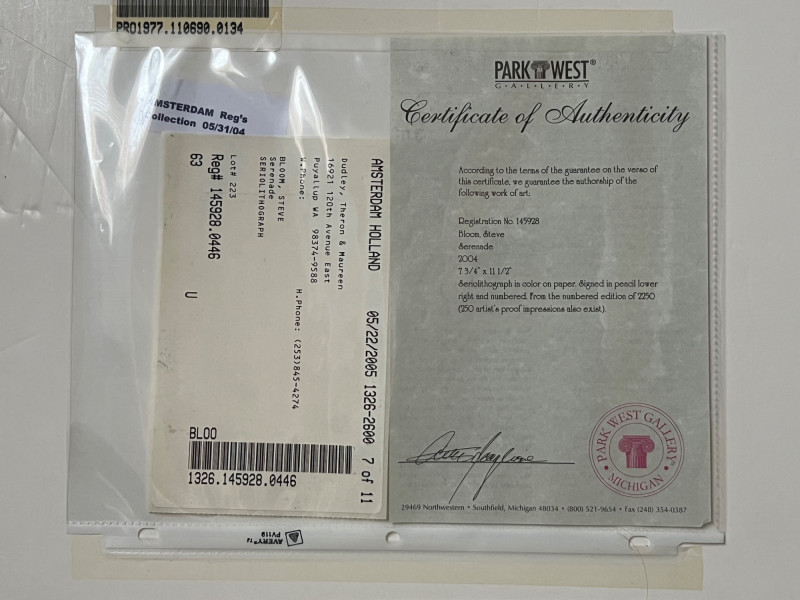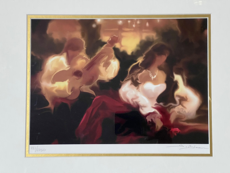 Steve Bloom “Serenade” Steriolithograph in color on paper. Signed in pencil, lower right and numbered. Frame Dimensions 20.5 x 18" About the Artist: Steve Bloom has the unique ability to combine his mastery of the most ancient printmaking techniques with the most contemporary processes to create his internationally renowned imagery. Bloom is never content to work in one medium and has been exploring traditional and non-traditional image creation during the span of his career. Bloom produced editions that are collected all over the world. Years of professional experiences has truly made Bloom a master chromist who understands color and its relationship to printing, painting and design. A true pioneer of the digital art movement Steve was early on one of the few to have his digital creations hanging in galleries. His stylized imagery reflects the emotion and movement he experiences in his appreciation of the musical and performing arts. **Shipping Available**
