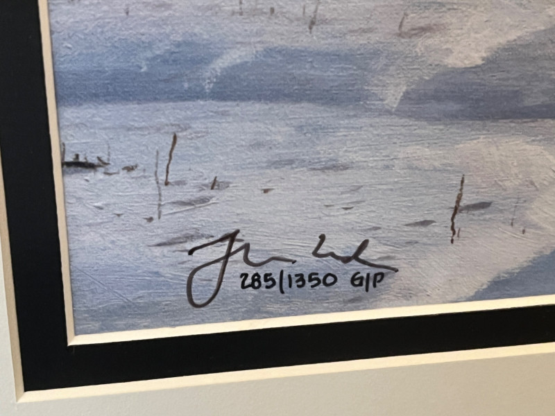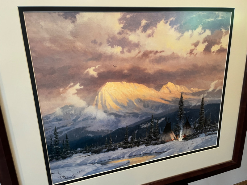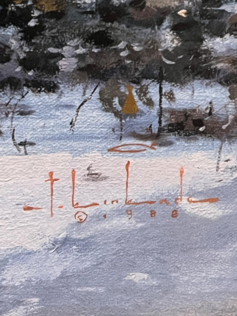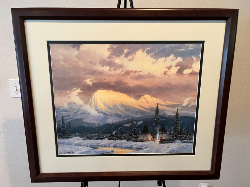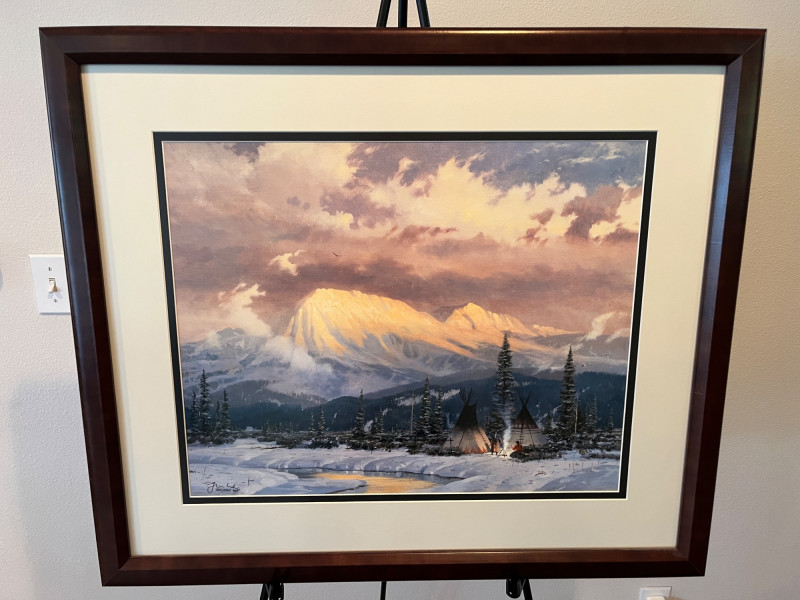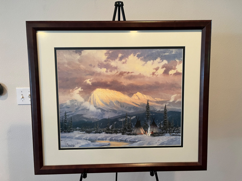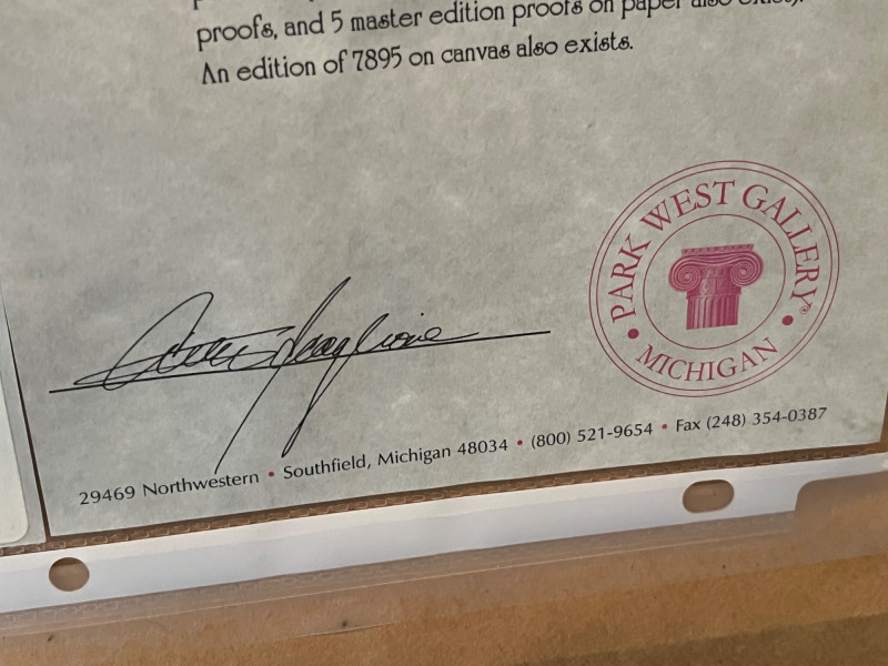 “Lingering Dusk" by Thomas Kinkade 285/1350 Offset Lithograph in color on premium paper Frame Size: 24x28 About the Artist: William Thomas Kinkade III, known as the “Painter of Light”, was an American artist who painted idyllic scenes in soft pastels. His work is known for its uplifting messages and masterful use of light and color. Kinkade created over 1,000 works, including the Disney Dreams Collection, and was featured in more than 120 books. He also painted the National Christmas Tree in Washington, D.C. twice. **Shipping Available**