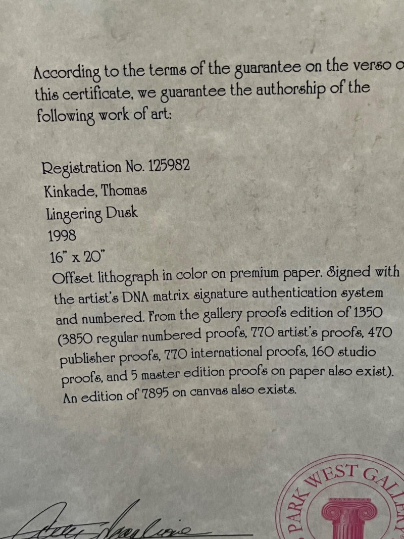 Lot # 44 - “Lingering Dusk" #'d Lithograph by Thomas Kinkade