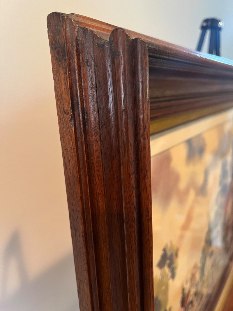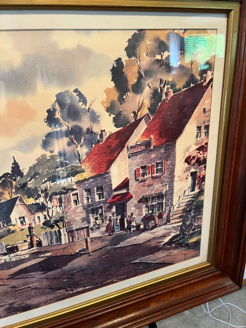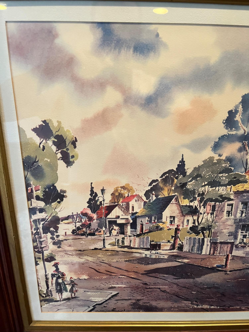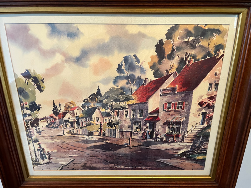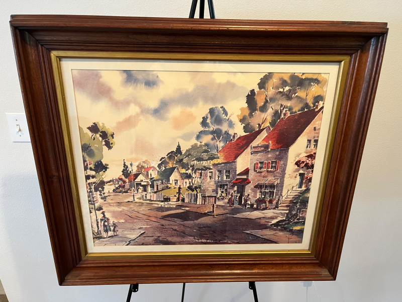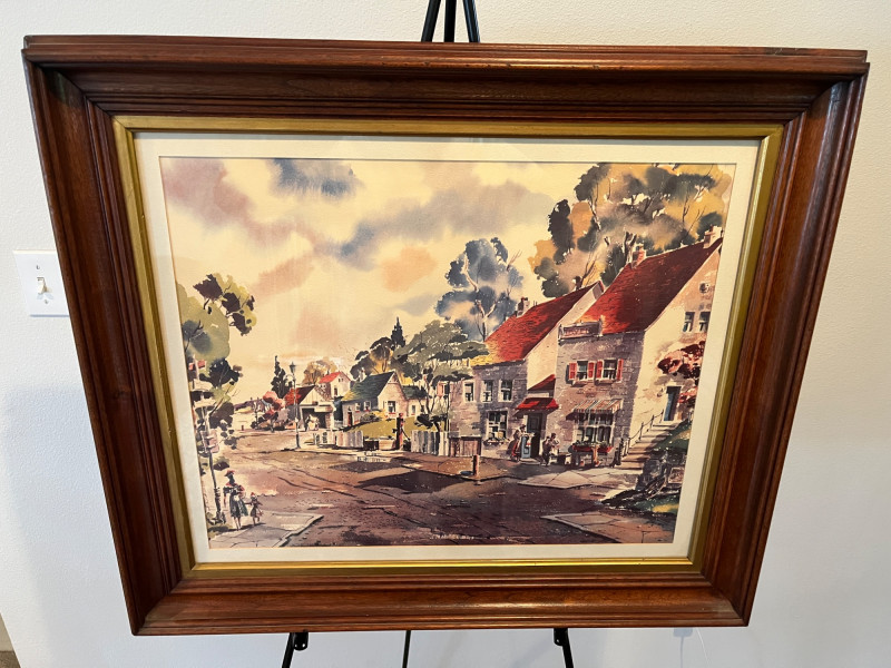 Artist Gavan Depicting French Neighborhood Antique/Purchased 70 Years Ago By Owner Frame Size: 25x 28.5" About the Artist: Joe Gavan was a painter in the 1940s. He worked for a time in animation and also in advertising. Most of his pieces seemed to be watercolors of landscapes, barns, covered bridges, farmhouses.
