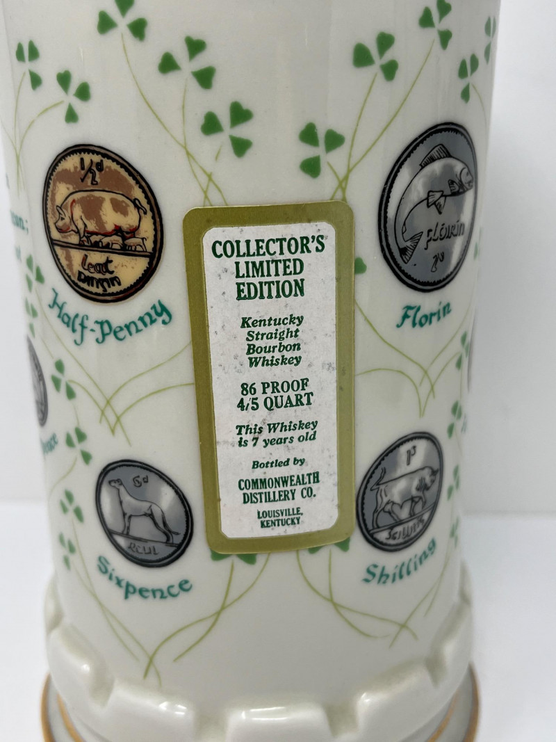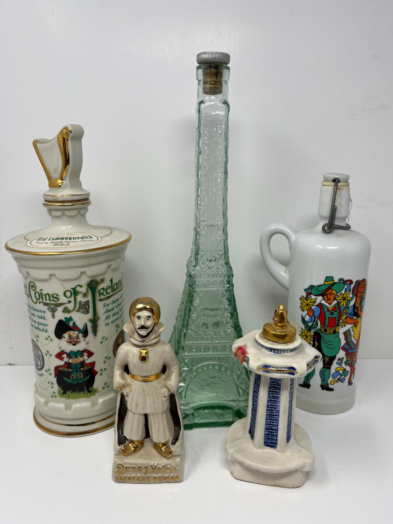 Lot Includes: 1979 "The Coins of Ireland" Old Commonwealth Kentucky Straight Bourbon Whiskey decanter, vintage Anton Riemerschmid Munchen "Old Commonwealth" bottle, Vintage Dunes Hotel Las Vegas, NV Decanter/Bottle, 1974 Joe Kaufenberg Limited Edition Liquor Bottle (Empty) Las Vegas - Stardust, Eiffel Tower Vintage Decanter All Bottles/Decanters Empty & In Great Condition!
