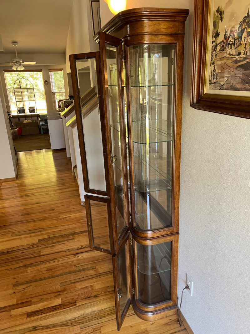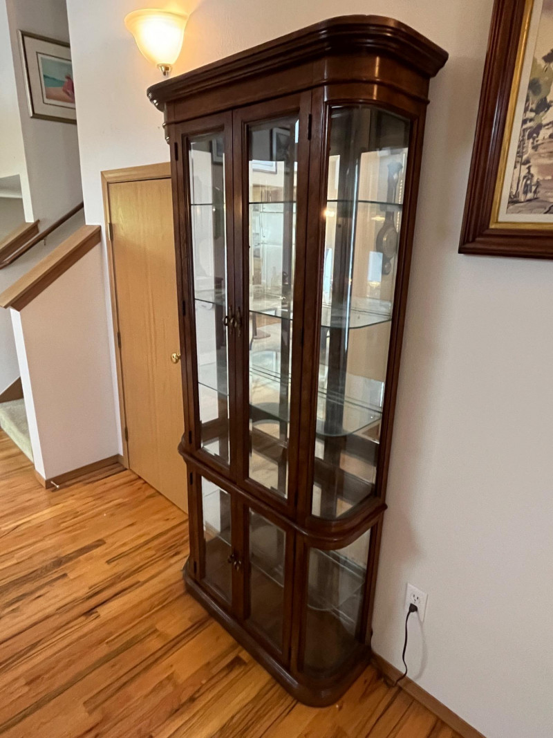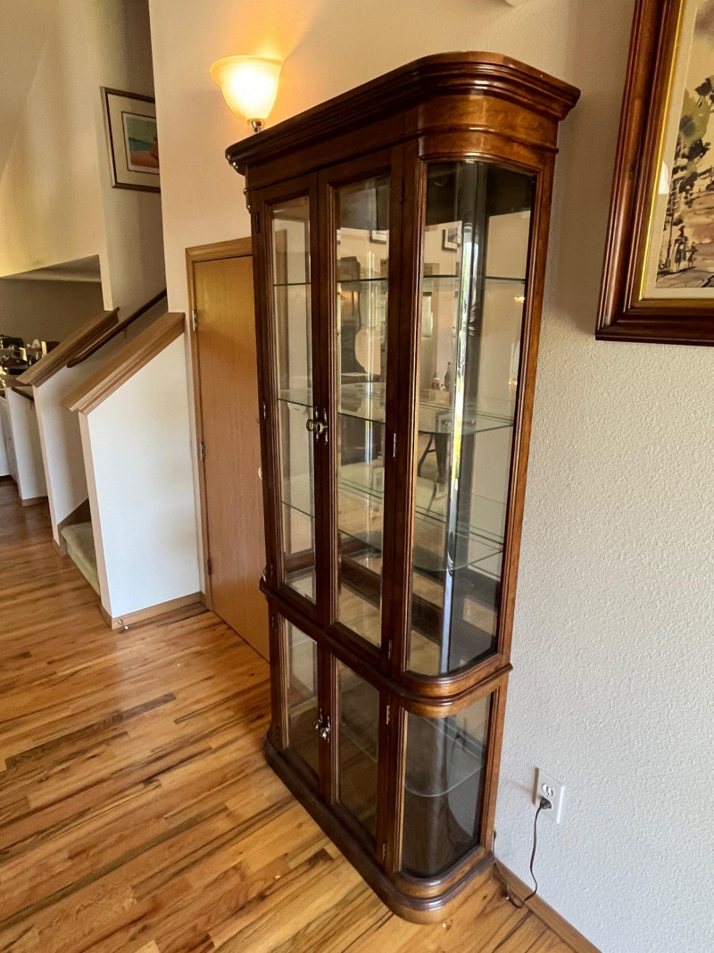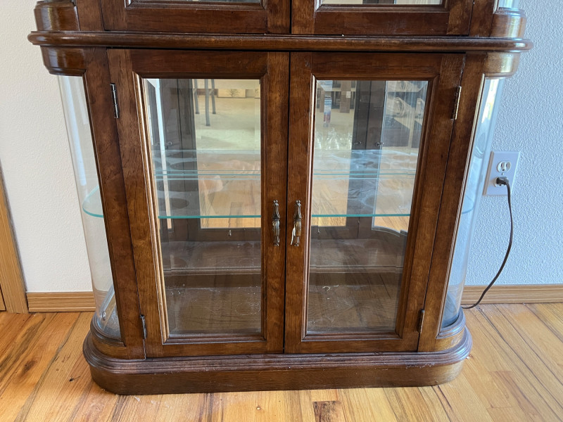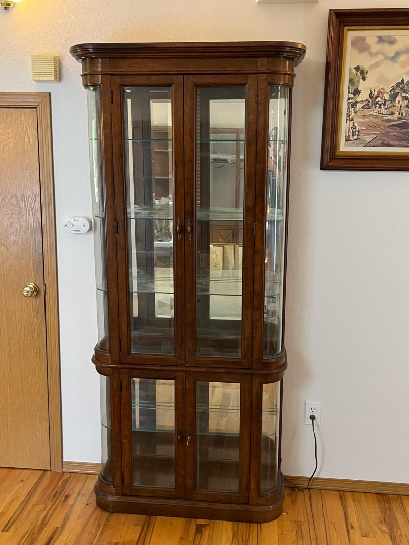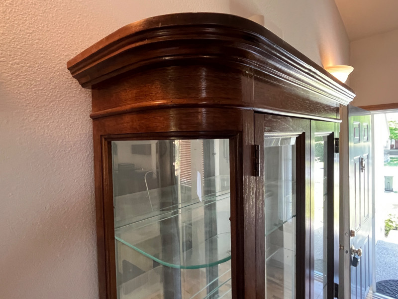 Gorgeous Vintage Pulaski Curved Glass Display Cabinet 76 x 32 x 11 The back of this tall curio cabinet sits flush against your wall to maximize visual impact without taking up too much floor space. Maple Finish/Double Door