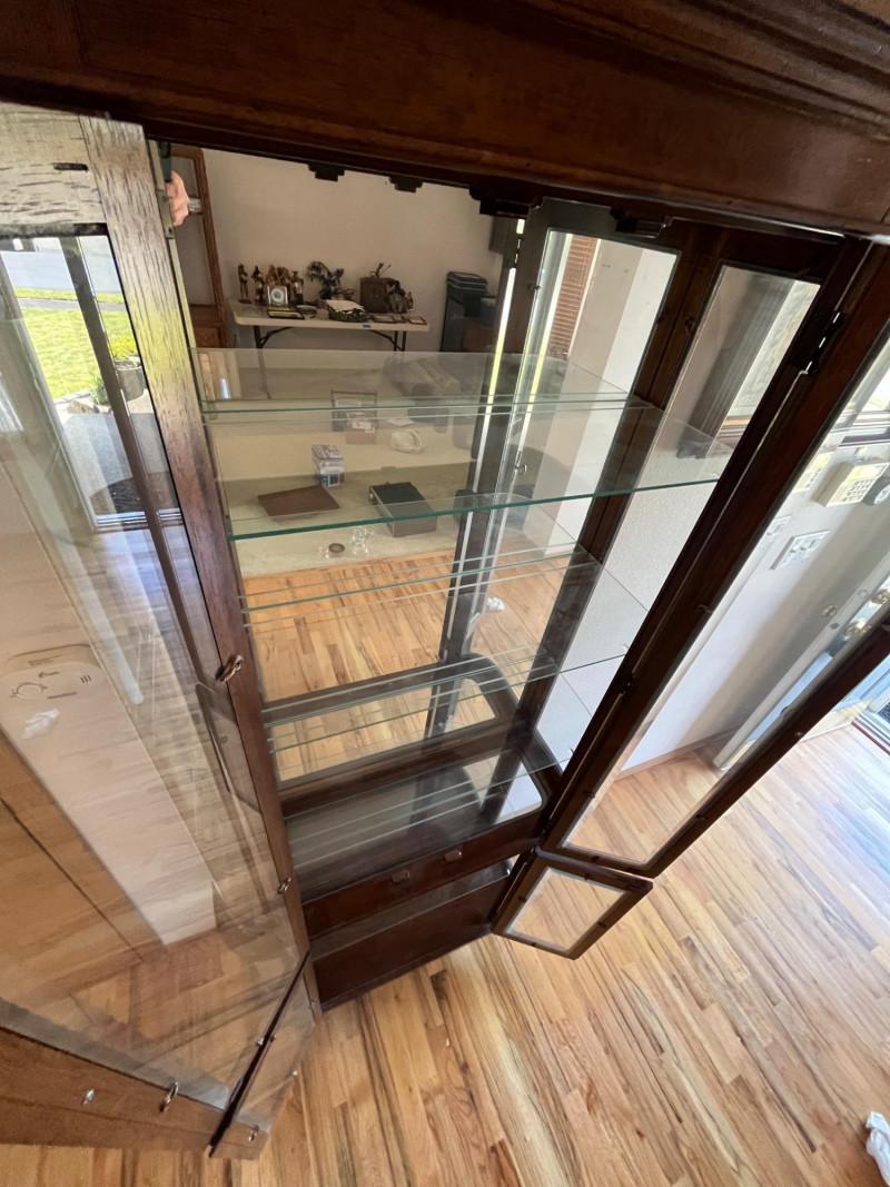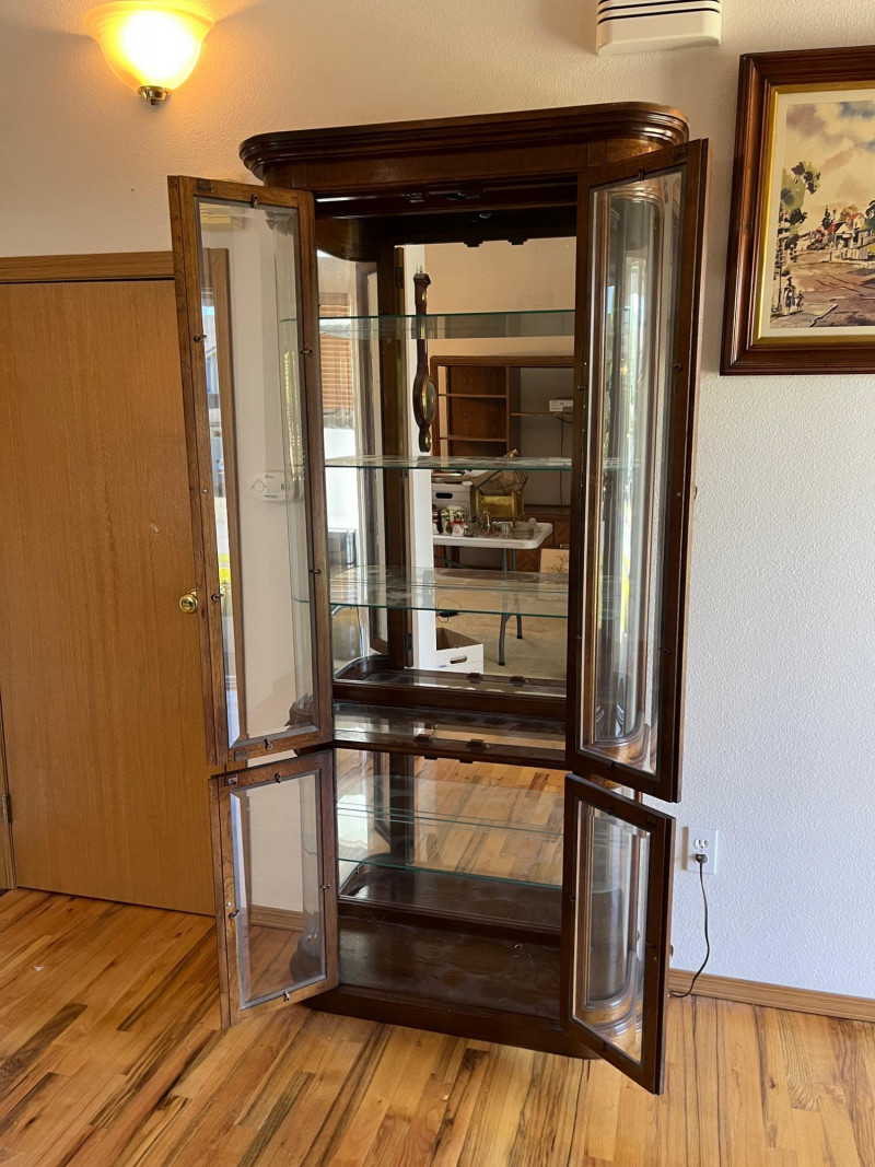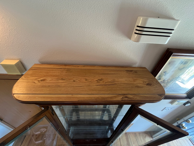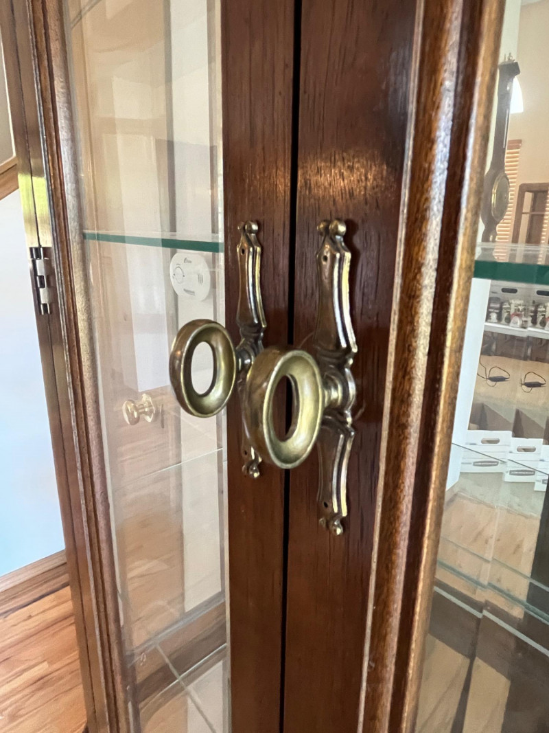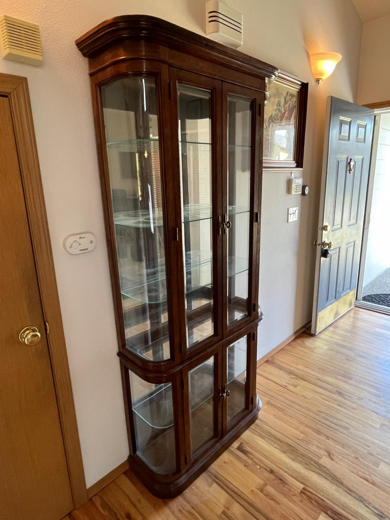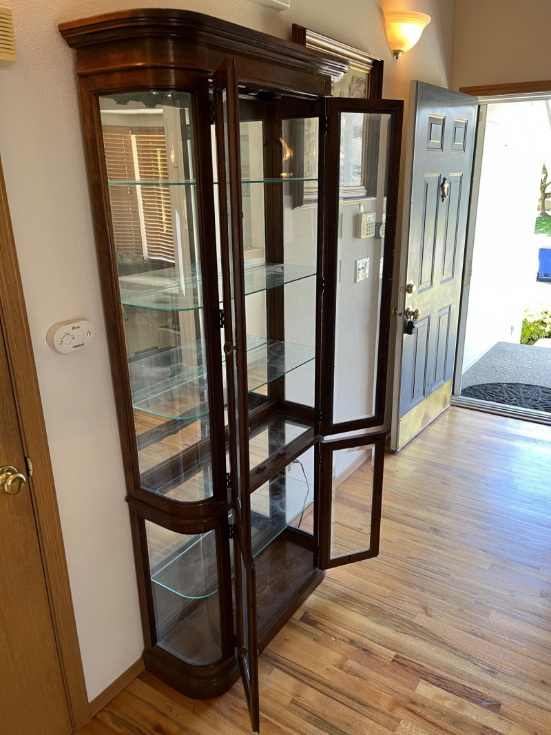 Gorgeous Vintage Pulaski Curved Glass Display Cabinet 76 x 32 x 11 The back of this tall curio cabinet sits flush against your wall to maximize visual impact without taking up too much floor space. Maple Finish/Double Door
