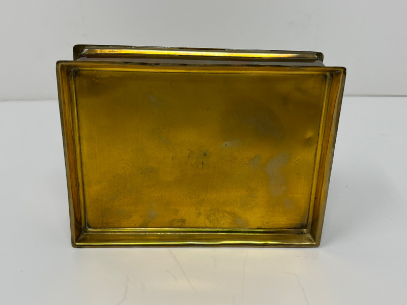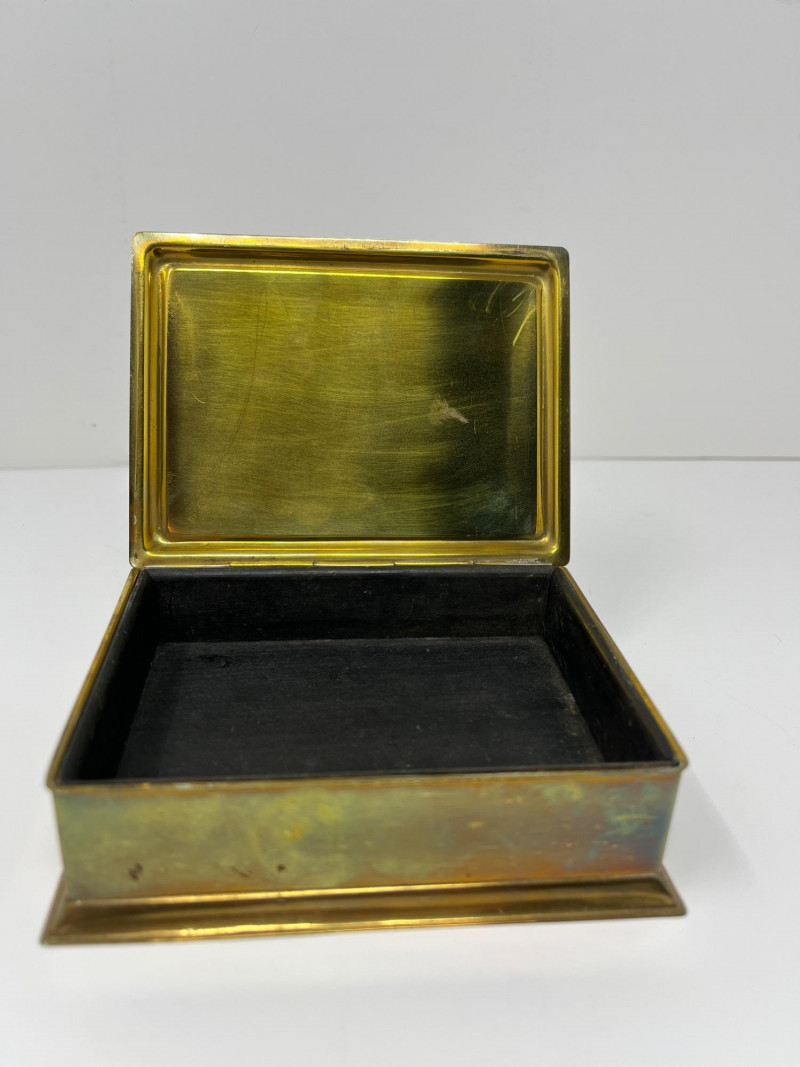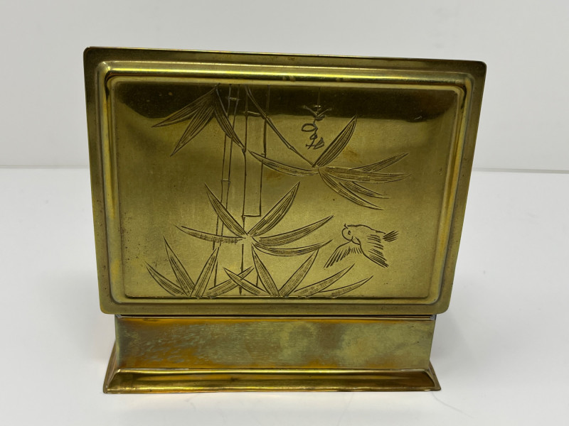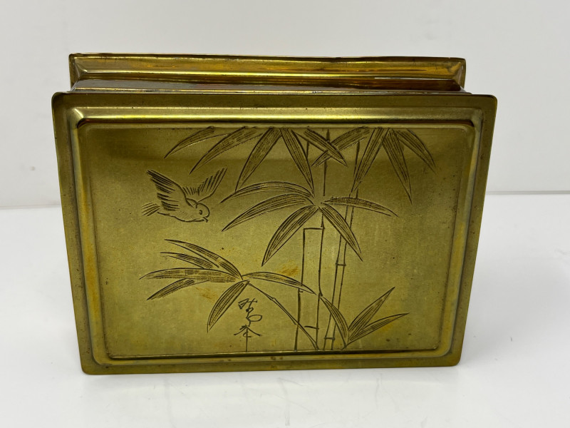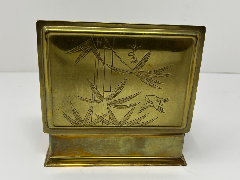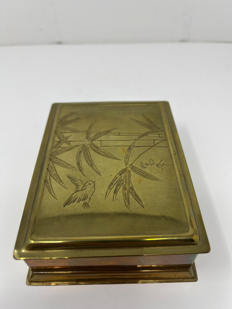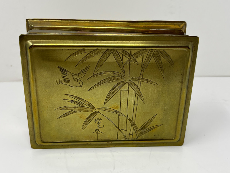 Vintage Japanese Goldstone Cloisonné Box Lid is etched with beautiful bamboo and bird imagery Brass with a black felt-lined interior Approximately 5x7x2.5"