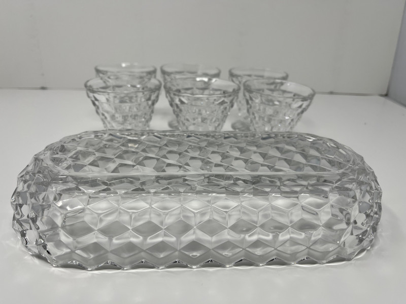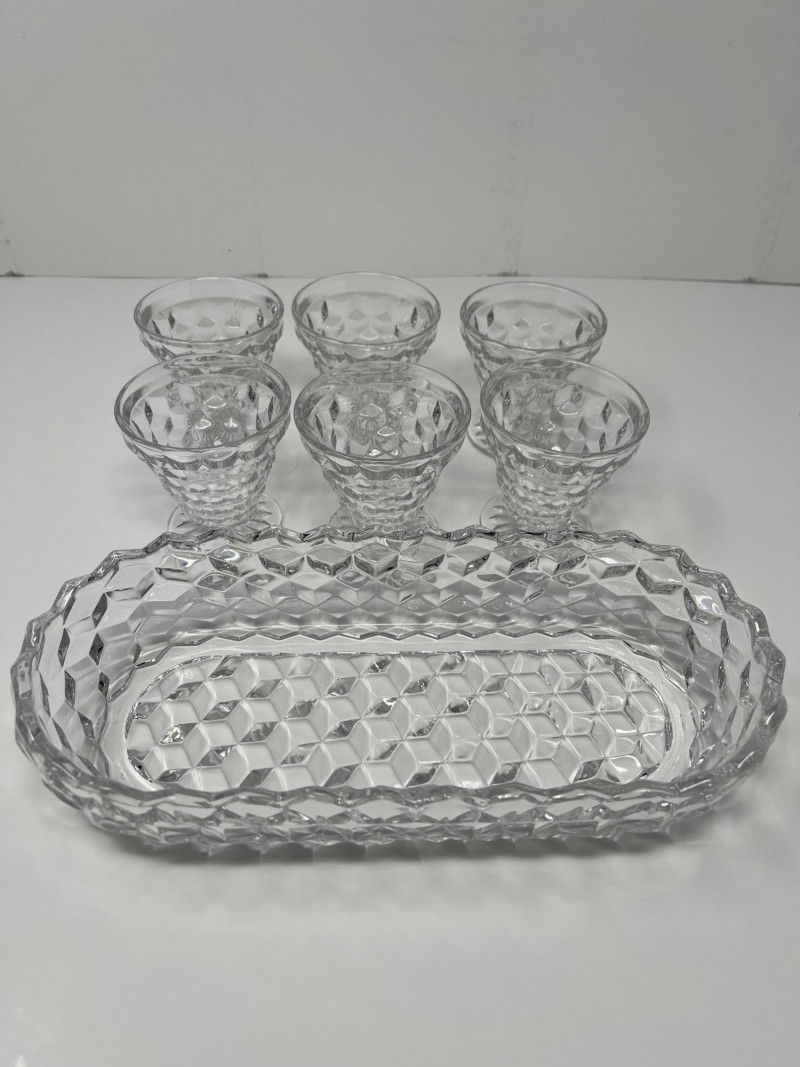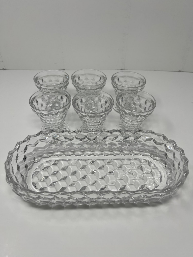 Vintage Fostoria Glass Lot Fostoria "Cubist" Patter Relish Dish & Shrimp Cocktail Glasses (6) Great Condition!