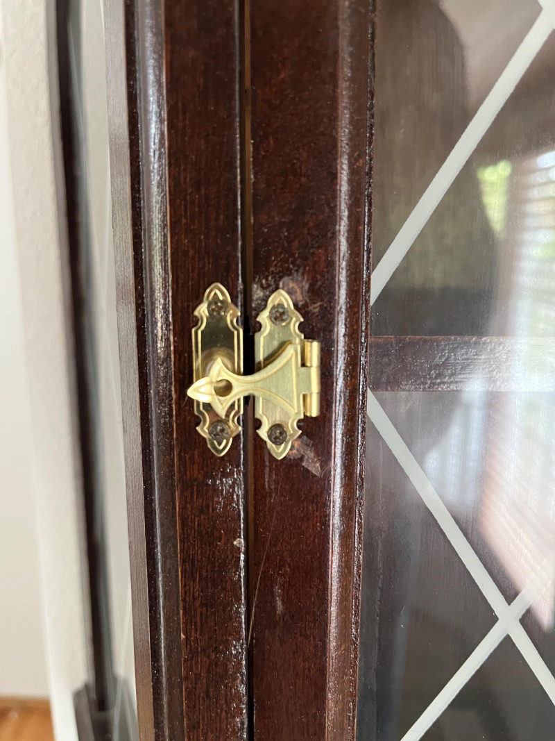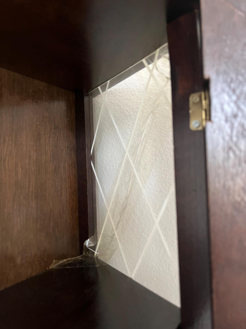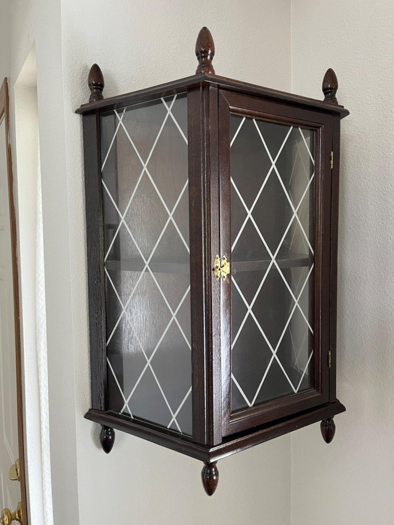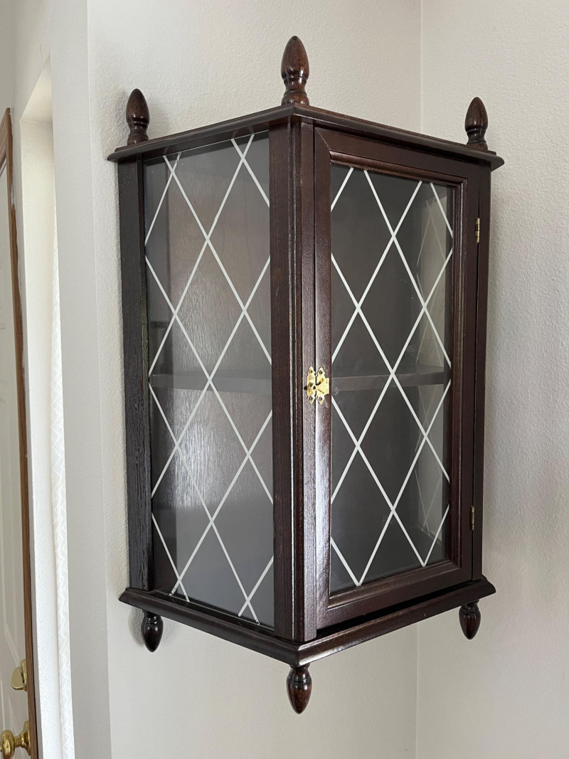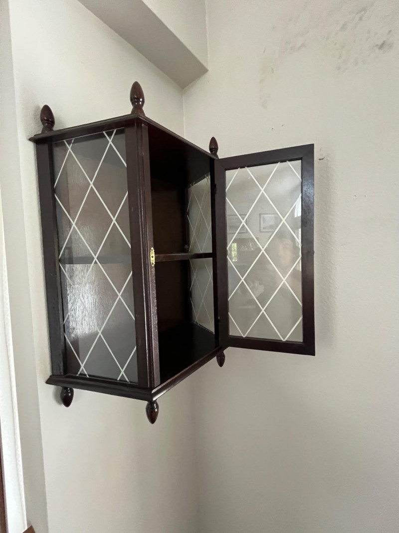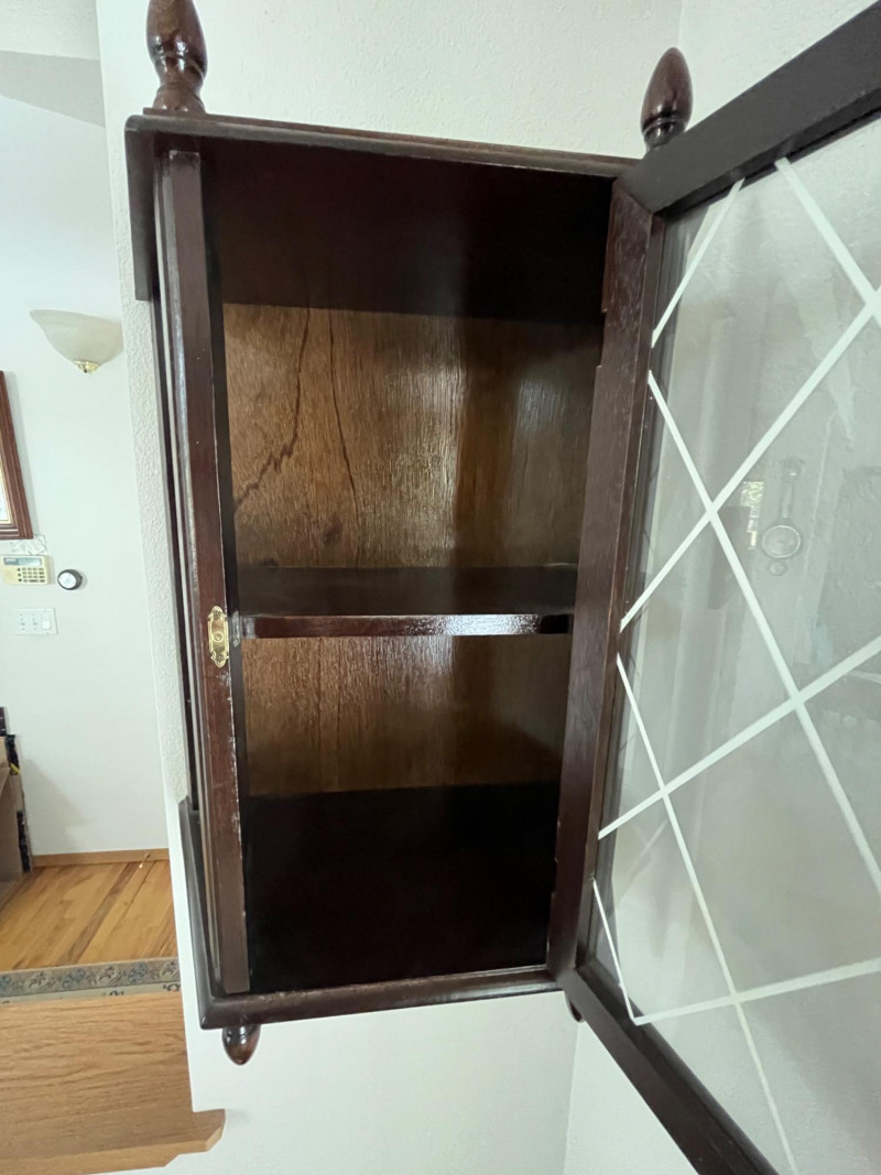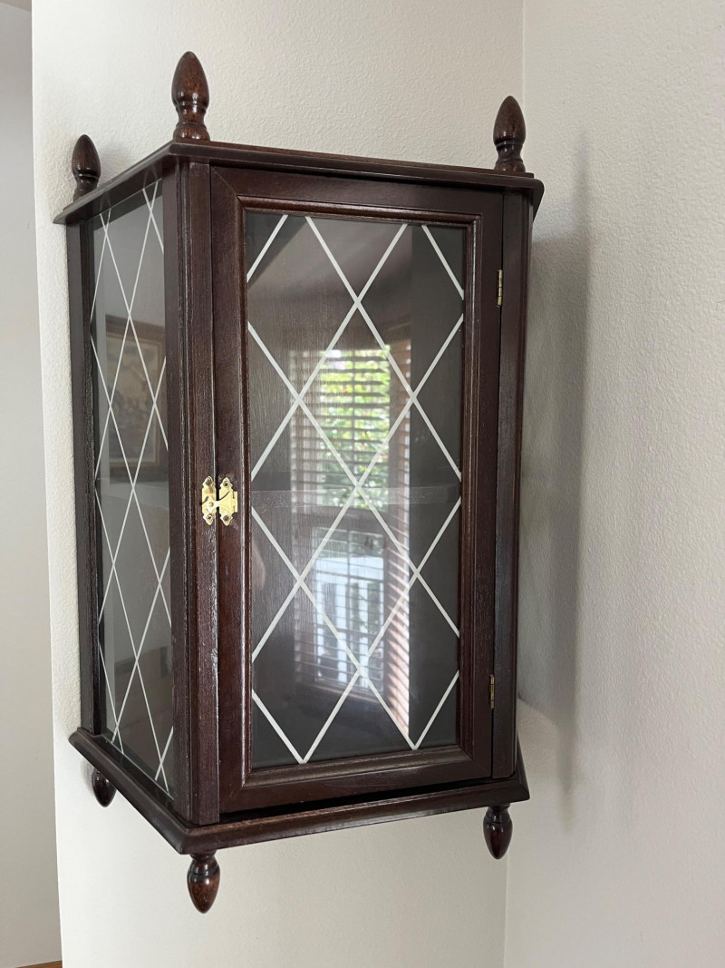 Vintage Wall Mounted Curio Cabinet Cabinet Dimensions: 23x17x8”D Crack along right side being held by tape