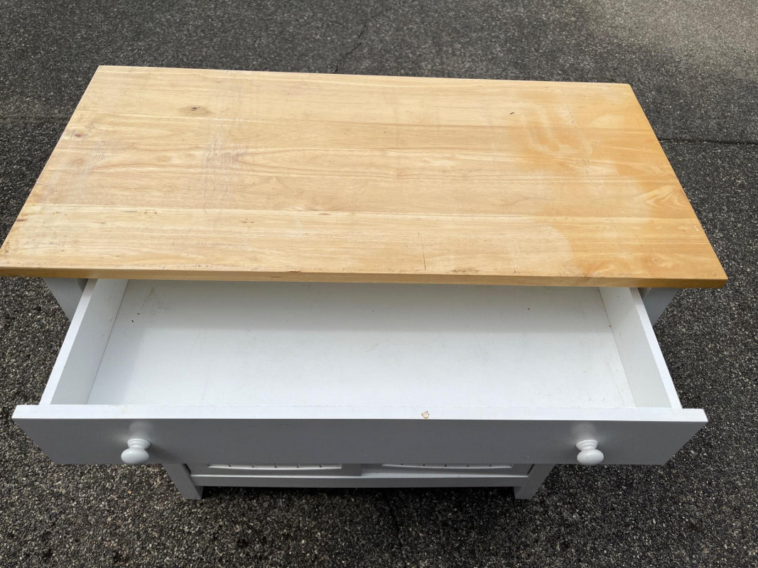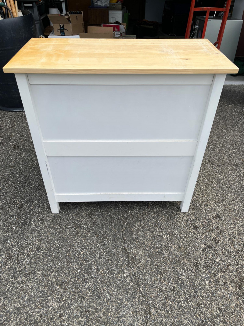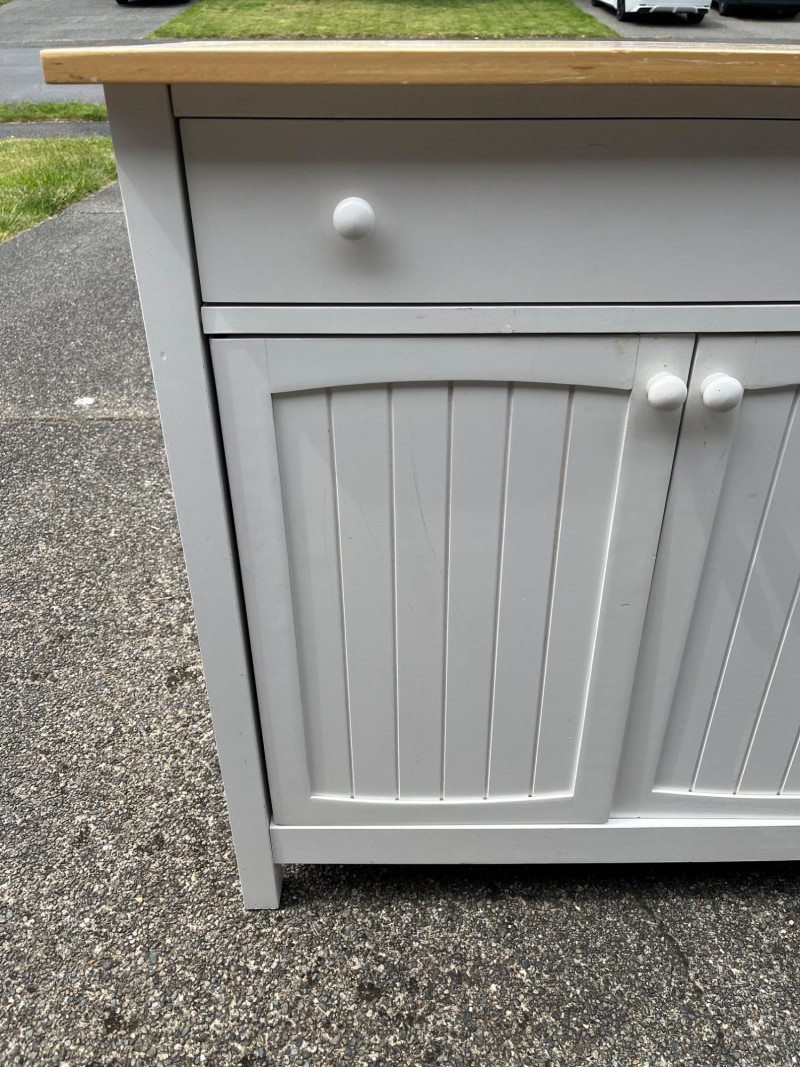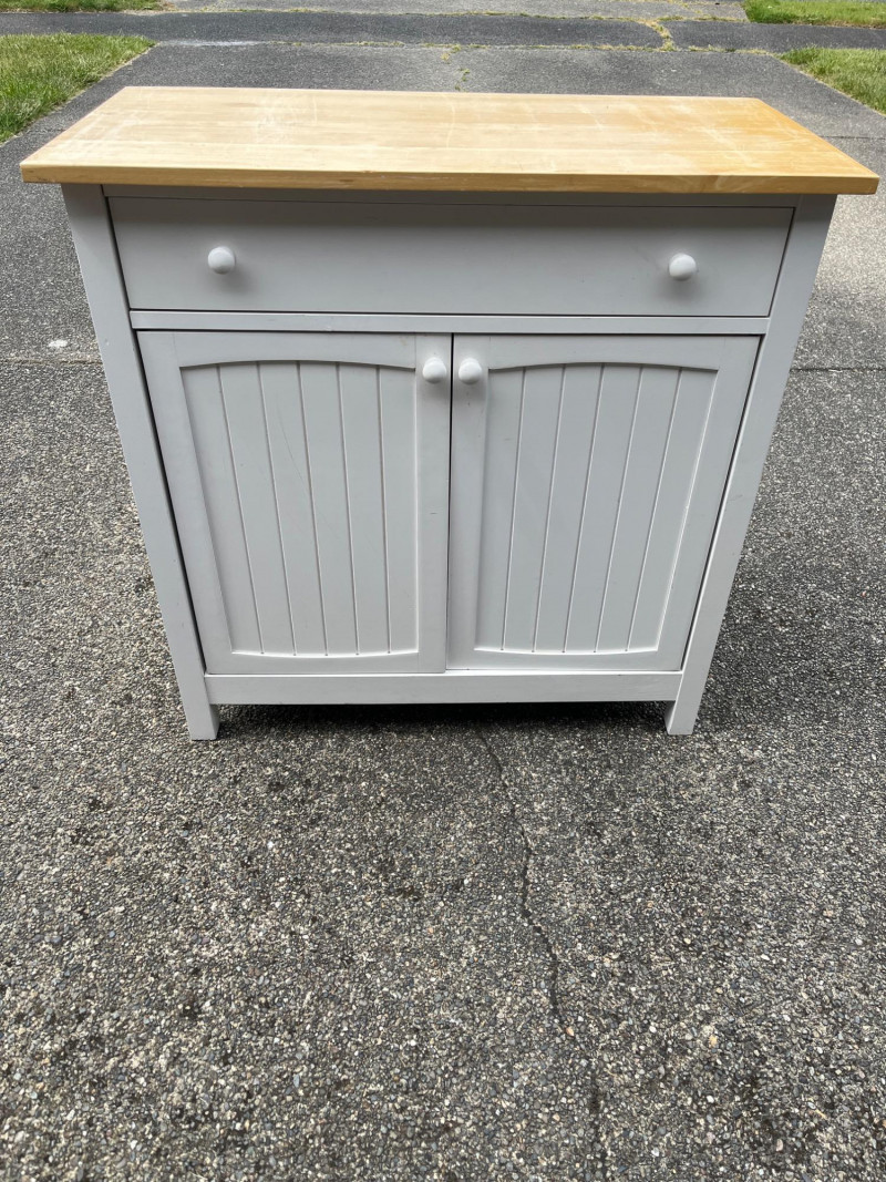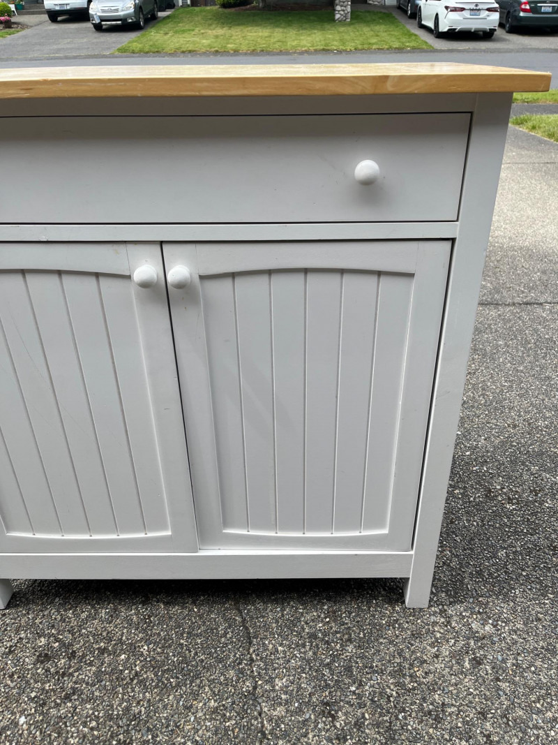 White Cabinet w/ Wood Top Dimensions: 36x18x36 Large Top Drawer & Spacious Cabinet Storage Normal Wear On Wood Top