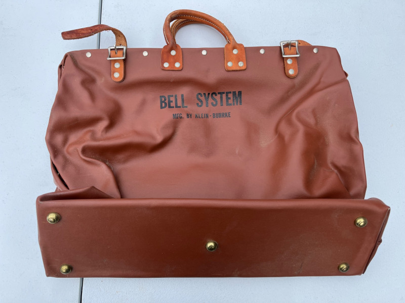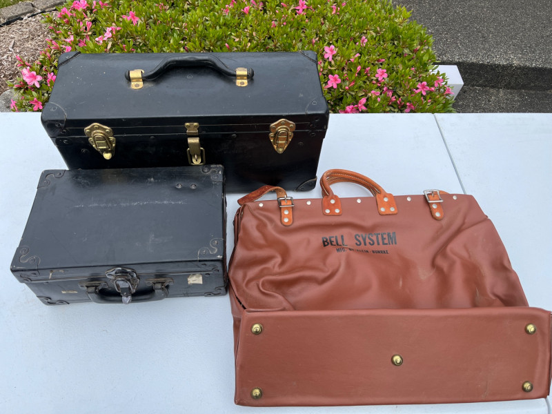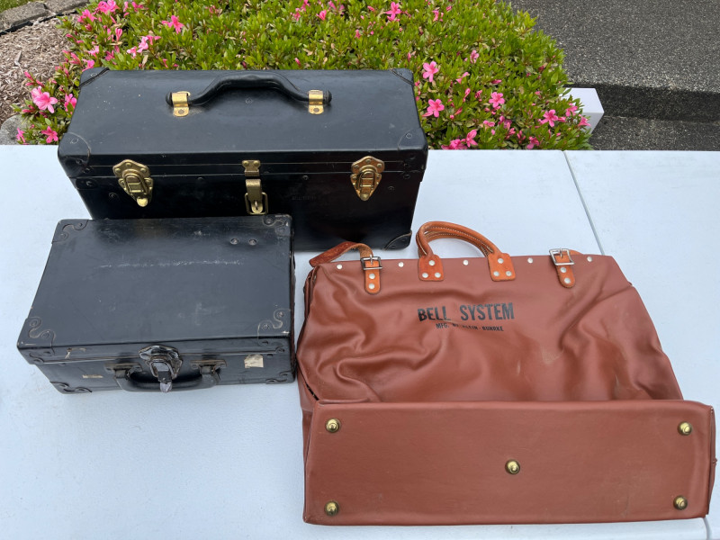 Lot Includes: Two Vintage PacBell Leather Tool Boxes & Leather Pac Bell Bag Large Leather Tool Chest 20x8x10 Small Leather Tool Chest 13x8x6