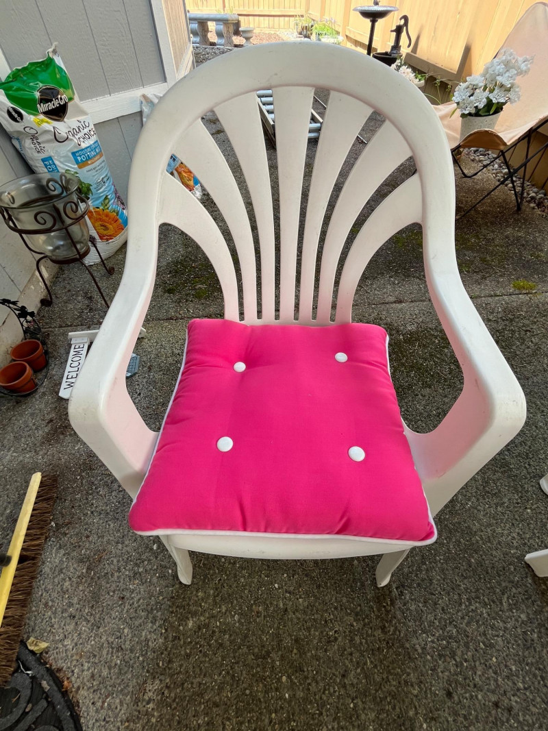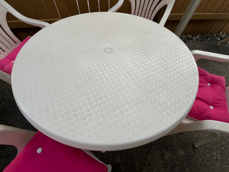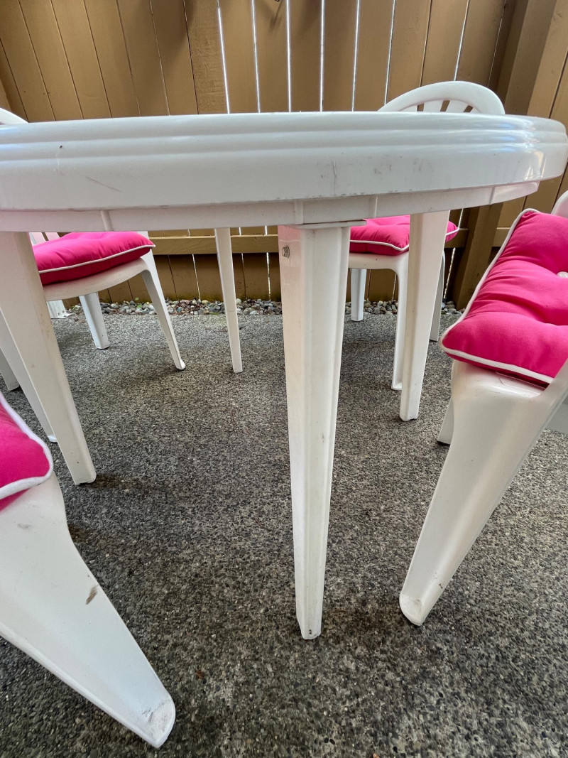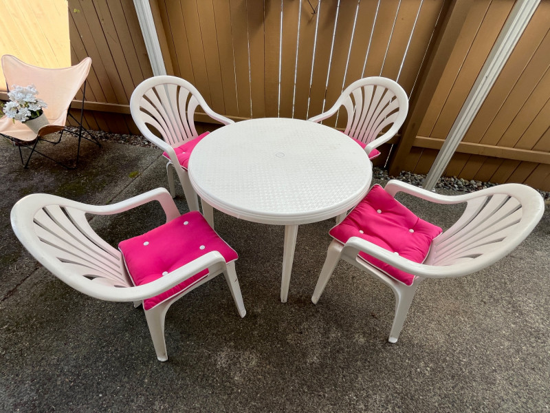 Lightweight/Sturdy Plastic Outdoor Dining Set Pink Cushions For Chairs Included 38" Table Diameter