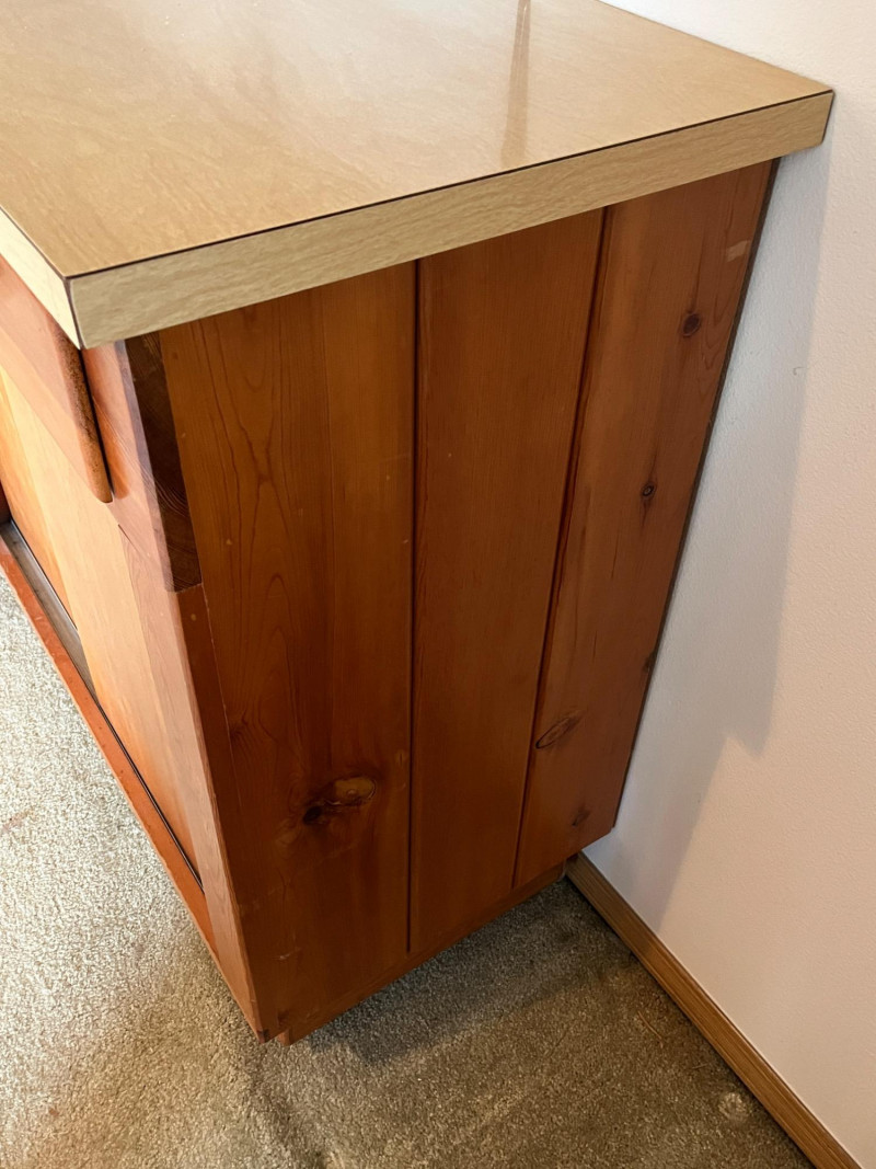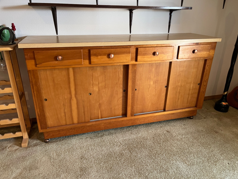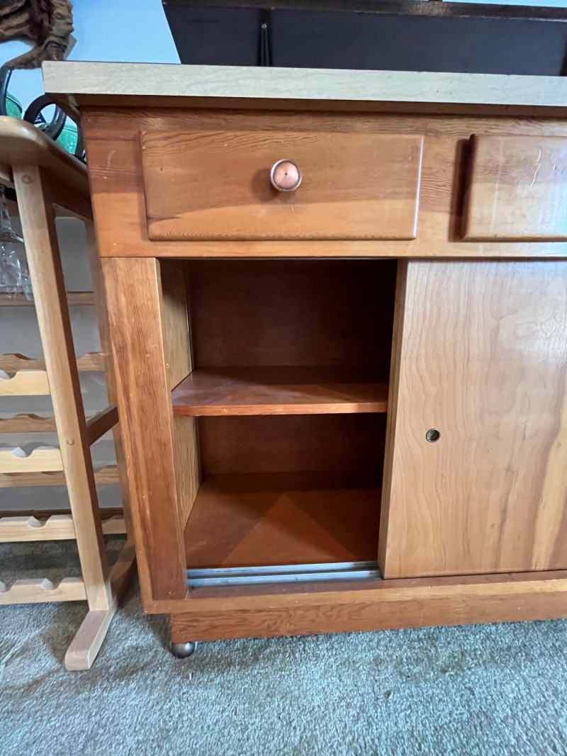 Rolling Pine Bar Cabinet On Casters One Of A Kind/Handmade By Owner 4 Top Pull Out Drawers & 2 Sliding Doors Unveiling A Large Storage Space Spacious Laminate Counter Top 70x18x36