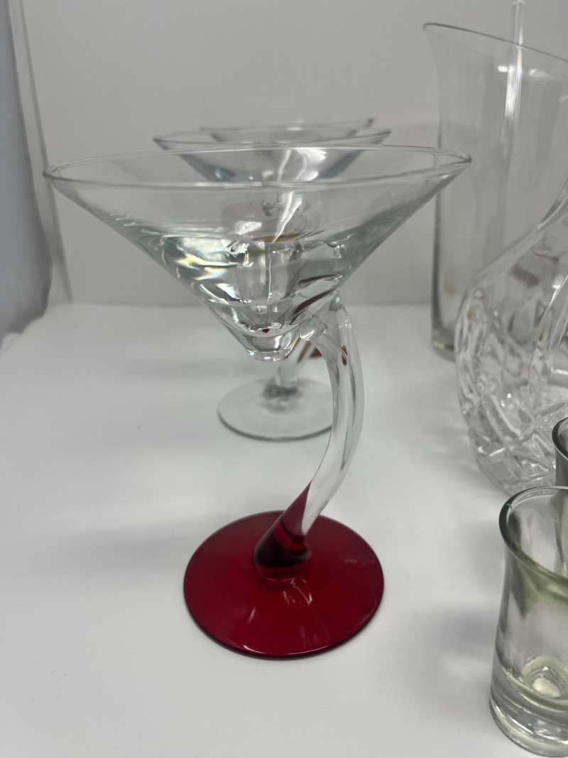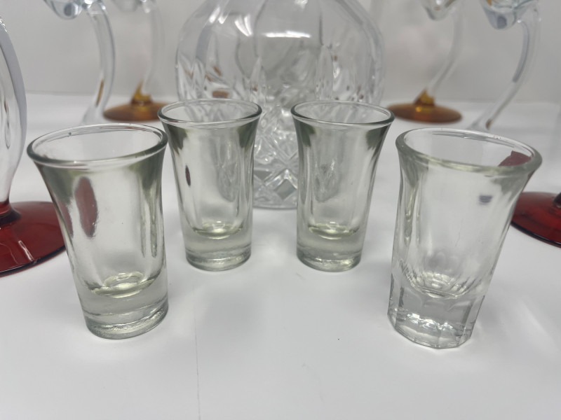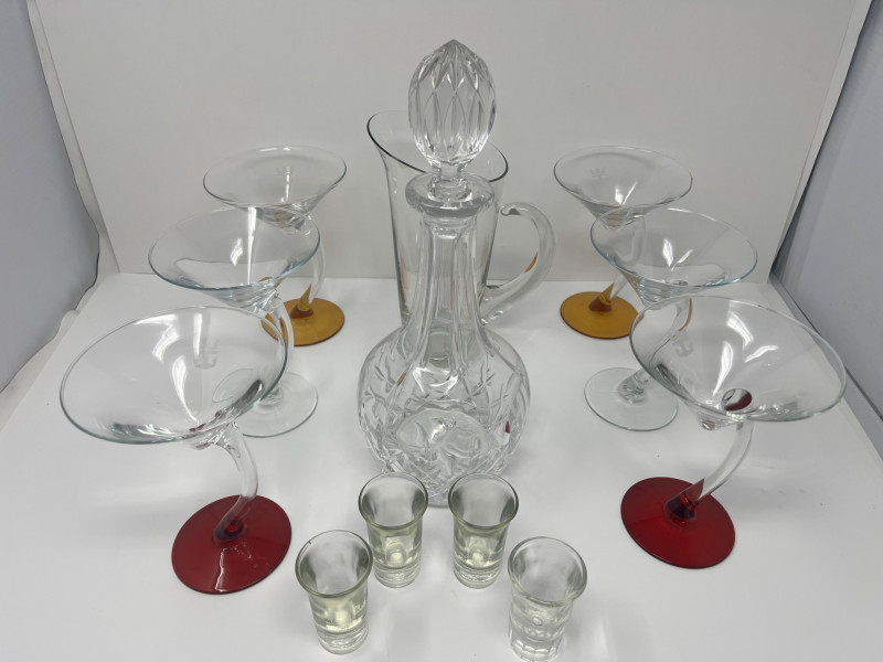 Lot Includes: 6 Libbey Curved Stem Margarita Glasses 1 Gorgeous Atlantis Fernando Lead Crystal Decanter 1 Drink Pitcher w/ Stir Stick 4 Shot Glasses
