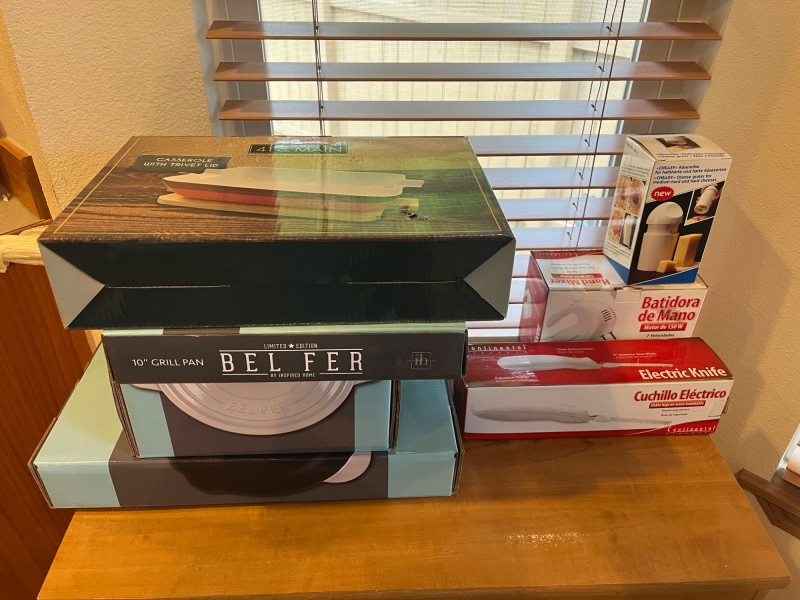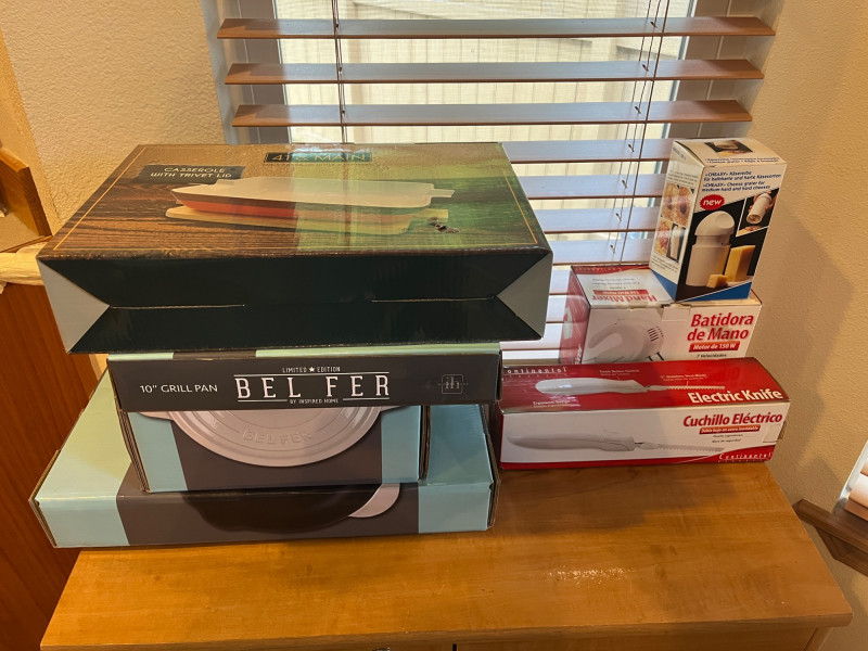 Lot Includes: 3qt Dutch Oven, 10.25" Skillet, 10" Grill Pan, Casserole Dish w/ Trivet, Electric Knife, Cheese Grader, Electric Hand Mixer