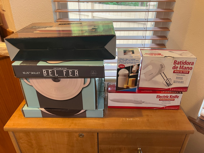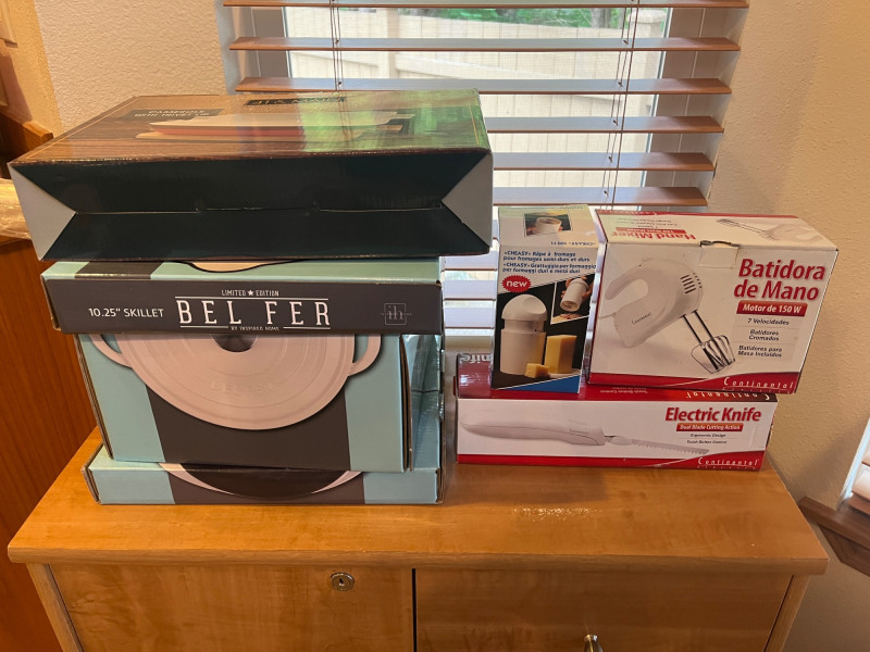 Lot Includes: 5qt Dutch Oven, 10.25" Skillet, 10" Grill Pan, Casserole Dish w/ Trivet, Electric Knife, Cheese Grader, Electric Hand Mixer