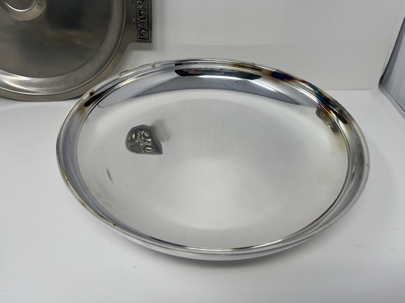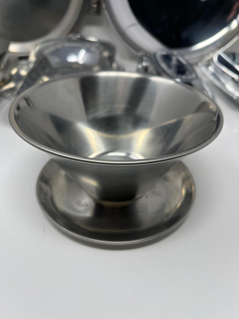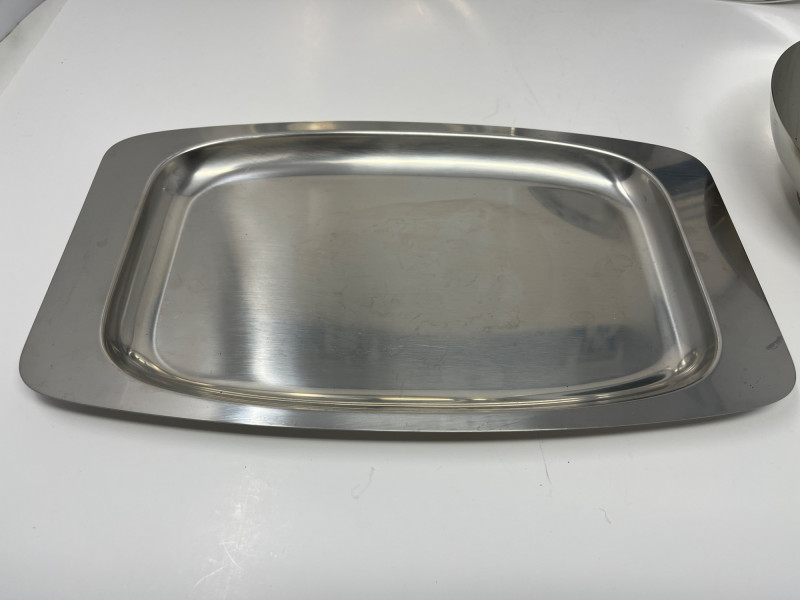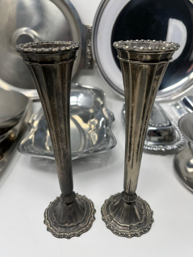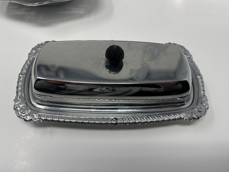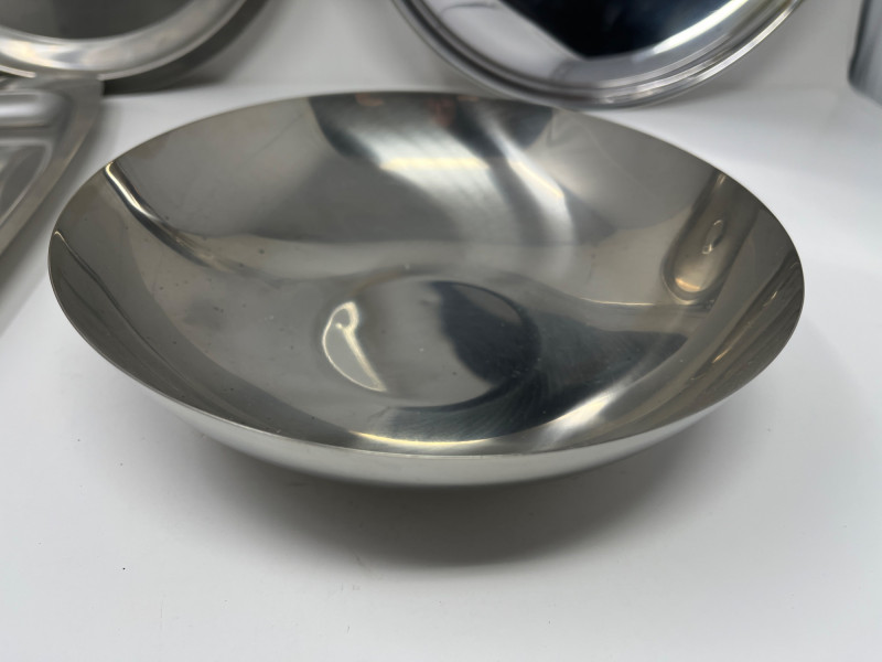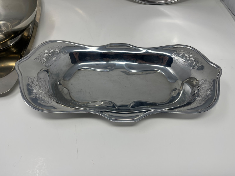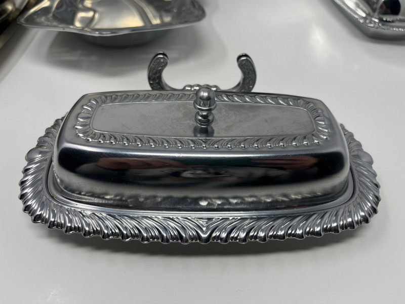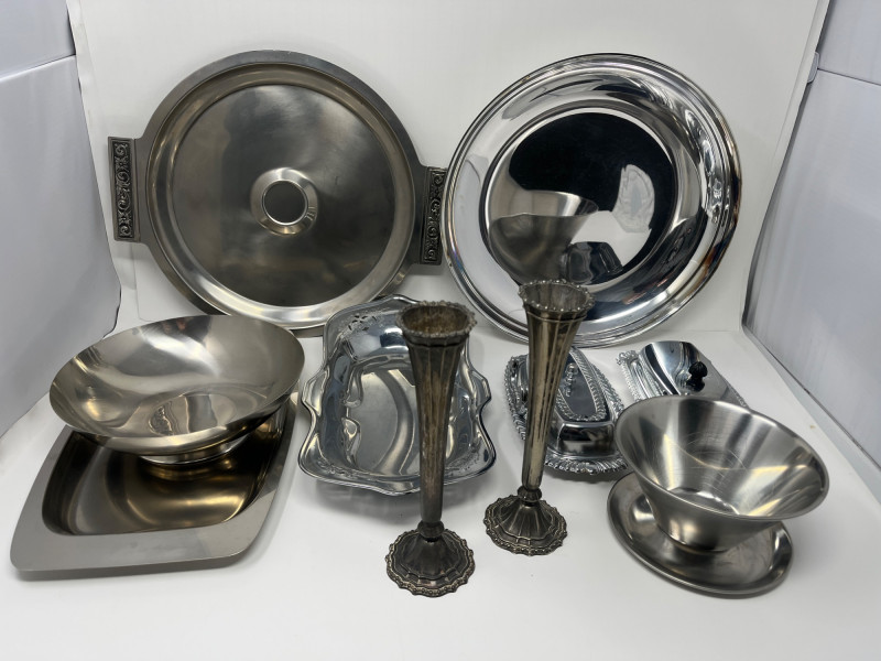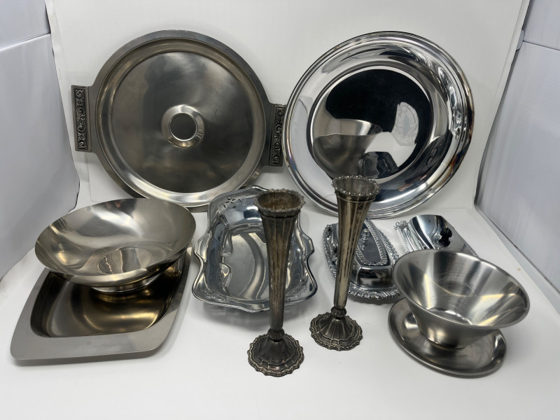 Lot Includes: Vintage Avon Single Bud Stainless Vases Qty: 2, International Decorator stainless steel serving tray, likely vintage from the mid-20th century, Stainless Gravy Boat, Stainless Silver Bowl, Stainless Serving Tray, 2 Vintage Stainless Butter Dishes, vintage Farberware Brooklyn silver-plated oblong serving tray