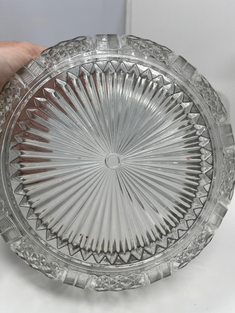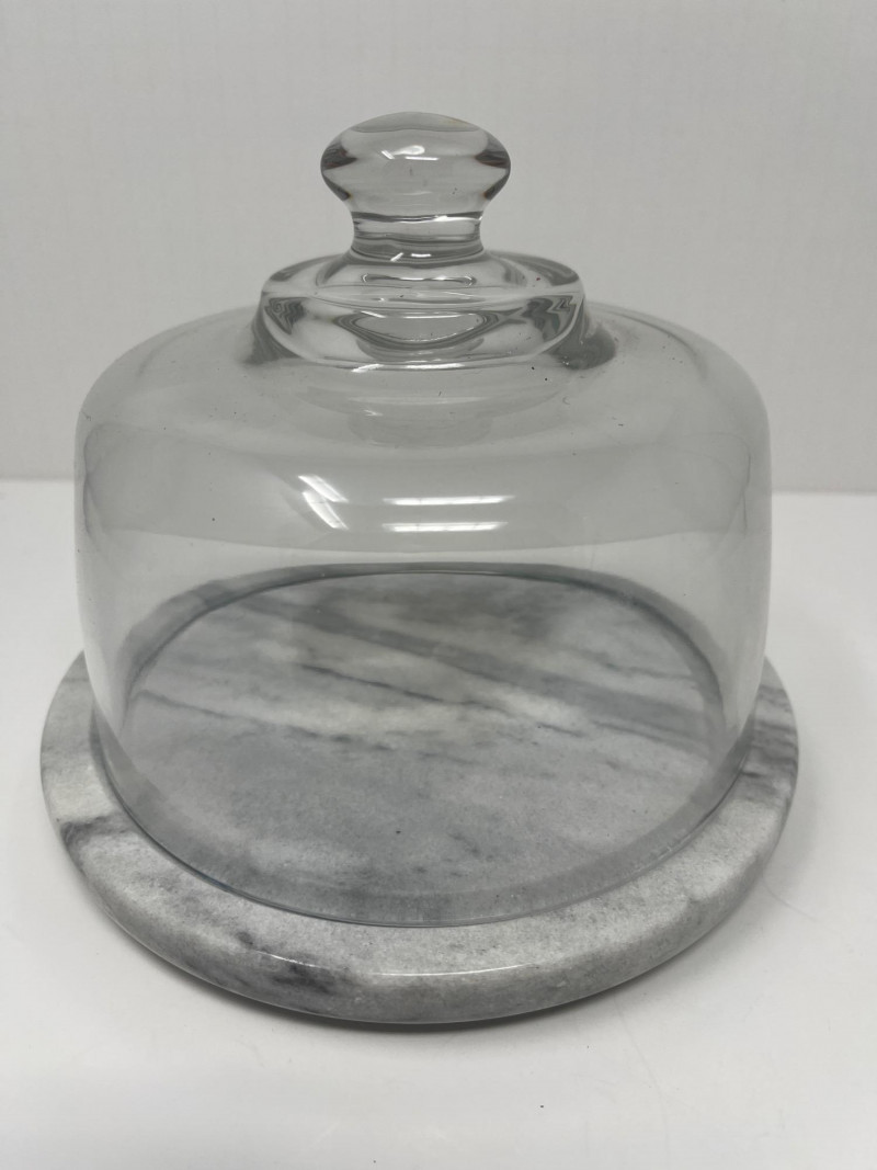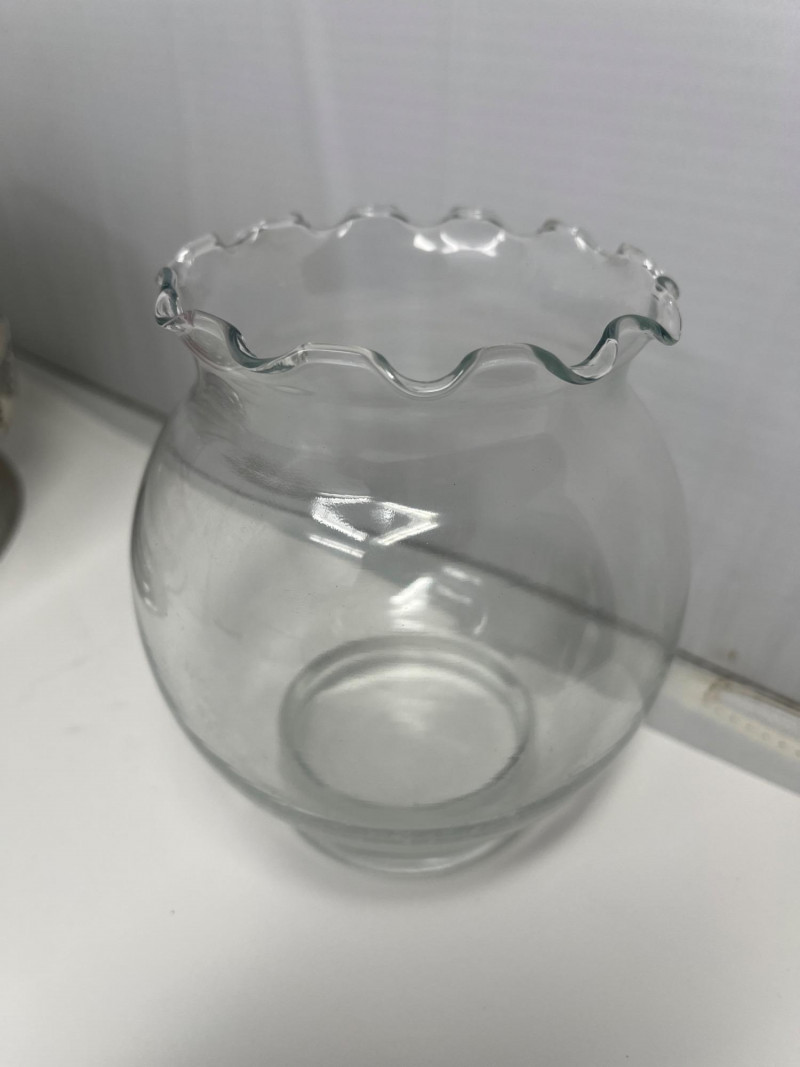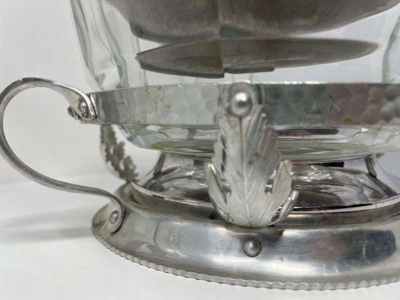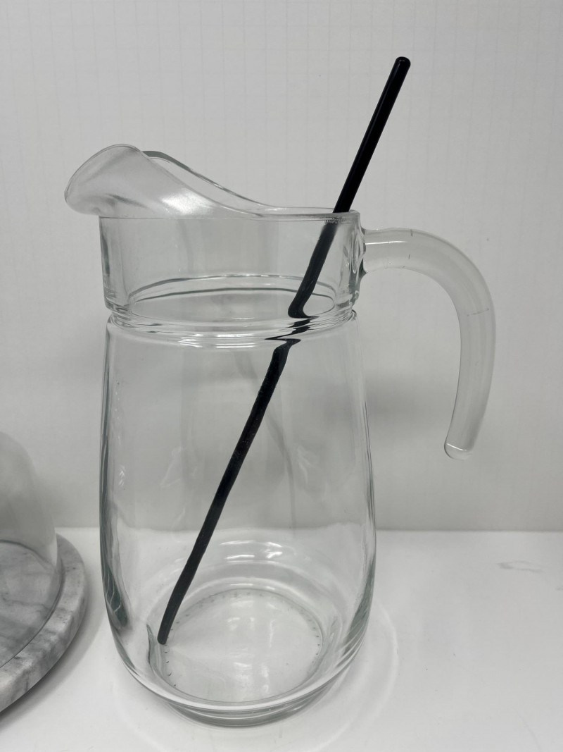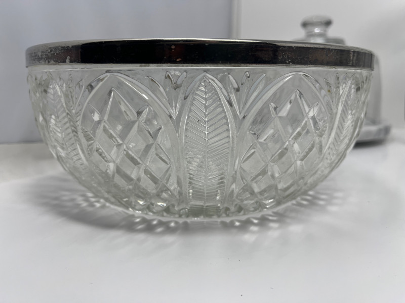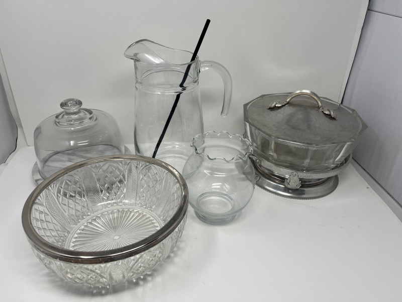 Lot Includes: Glass Pitcher w/ Stirrer, Vintage Clear Glass Covered Marble Based Cheese Dome, Fire King 2-quart glass casserole chafing dish with a chrome lid and warming stand, likely from the mid-20th century, Vintage Large Crystal Bowl with Silver Plated Rim, Vintage Scalloped Flower Vase