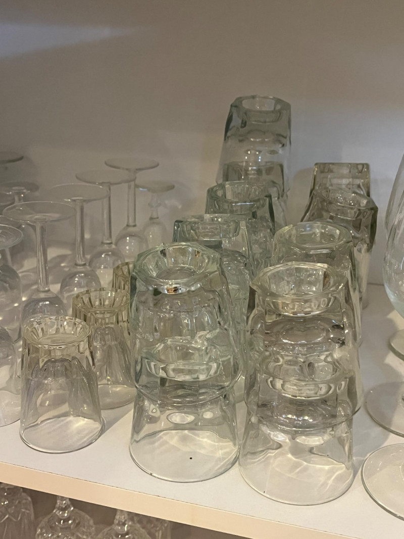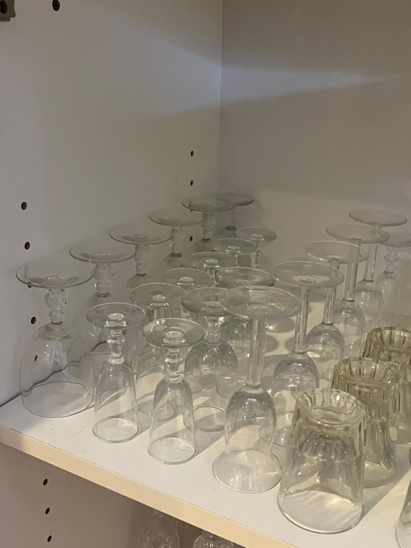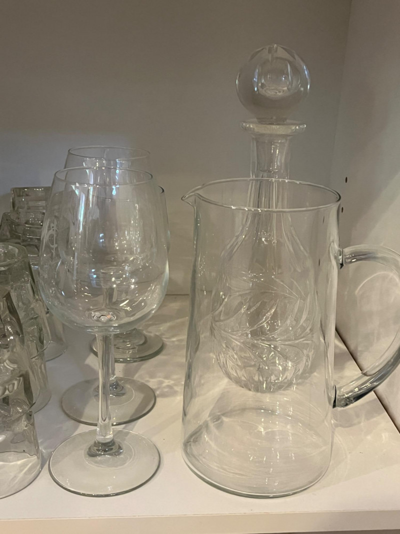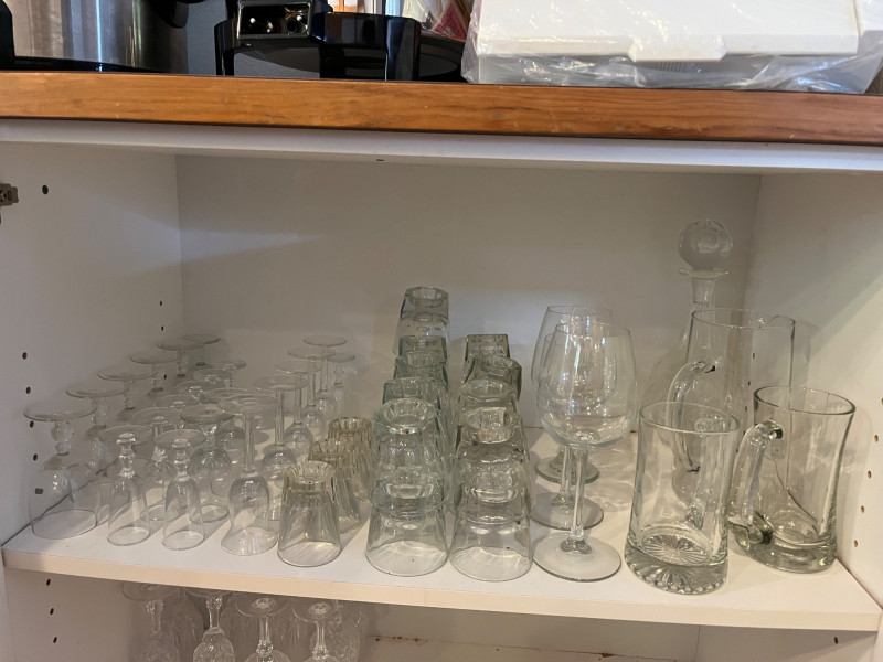 Cabinet Of Glassware (50+ Pieces) All Glassware Pictured Is Included In Lot! Lot Also Includes Lead Crystal Decanter & Gorgeous Glass Pitcher