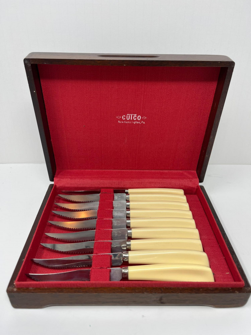 Vintage Quikut Serrated Steak Knives MCM 9 Ttoal w/ Case Tenite Cream Handles Great condition!