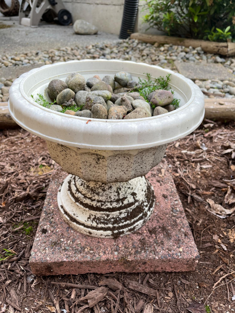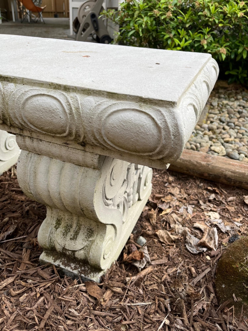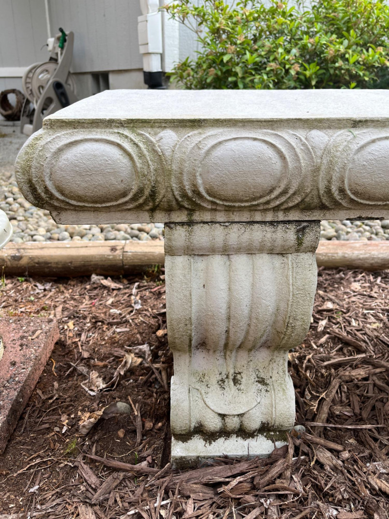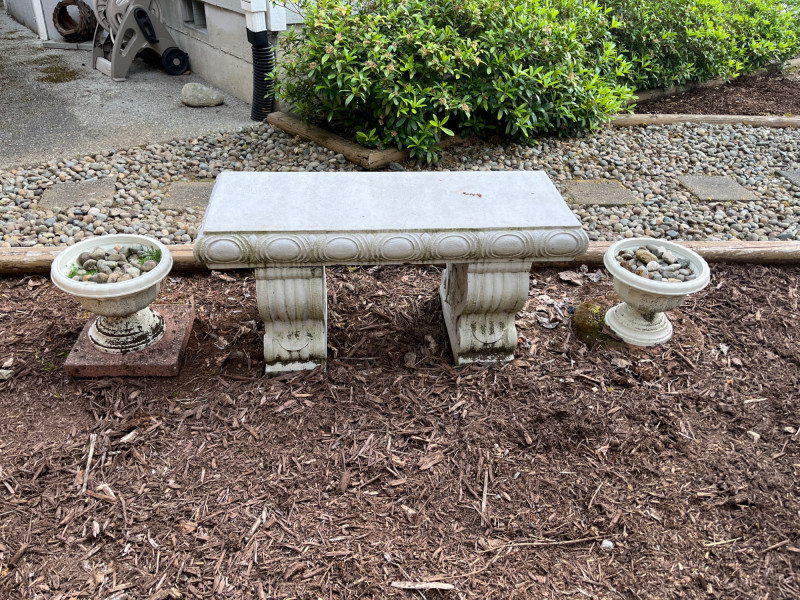 Garden Bench w/ Garden Urn Pots Bench Is Not Stone But Very Sturdy Bench Dimensions: 39” L x 18” Height Small Planters 11” Tall Plastic