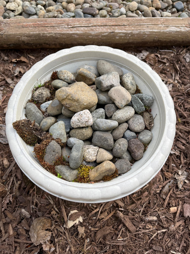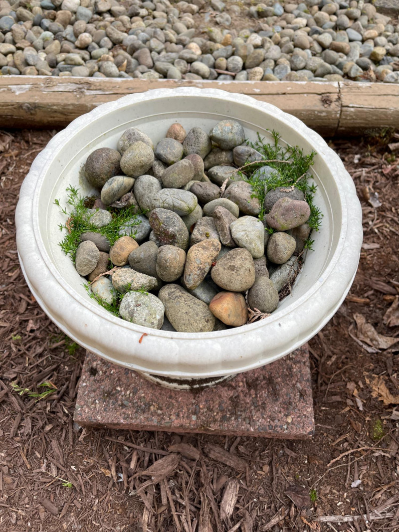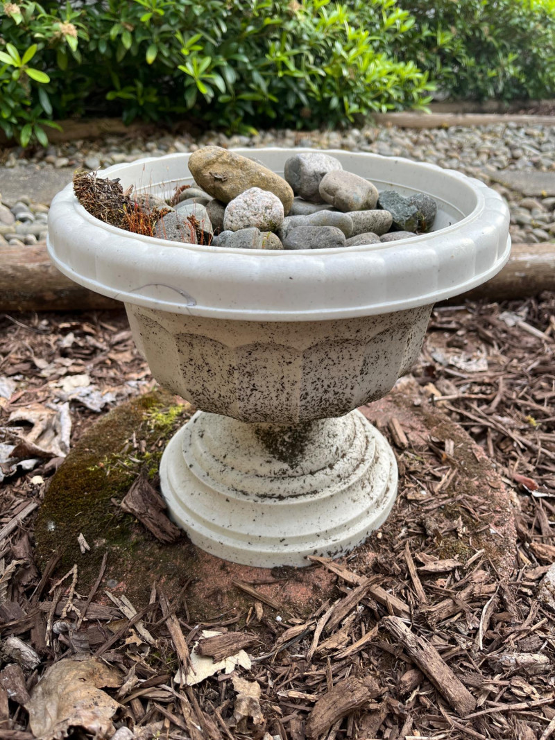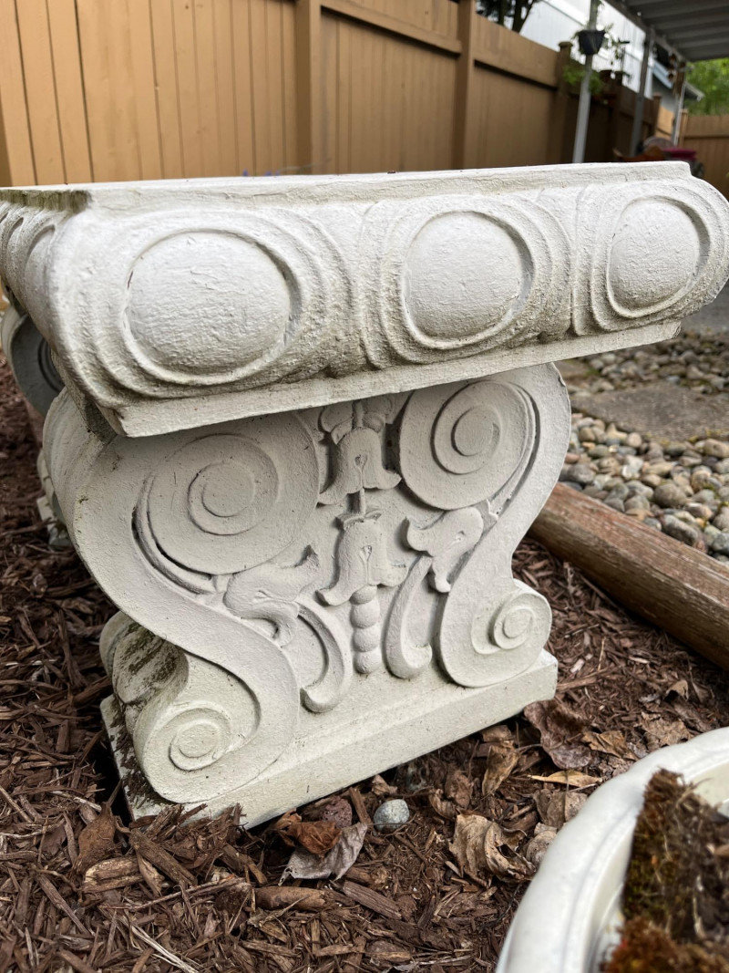 Garden Bench w/ Garden Urn Pots Bench Is Not Stone But Very Sturdy Bench Dimensions: 39” L x 18” Height Small Planters 11” Tall Plastic