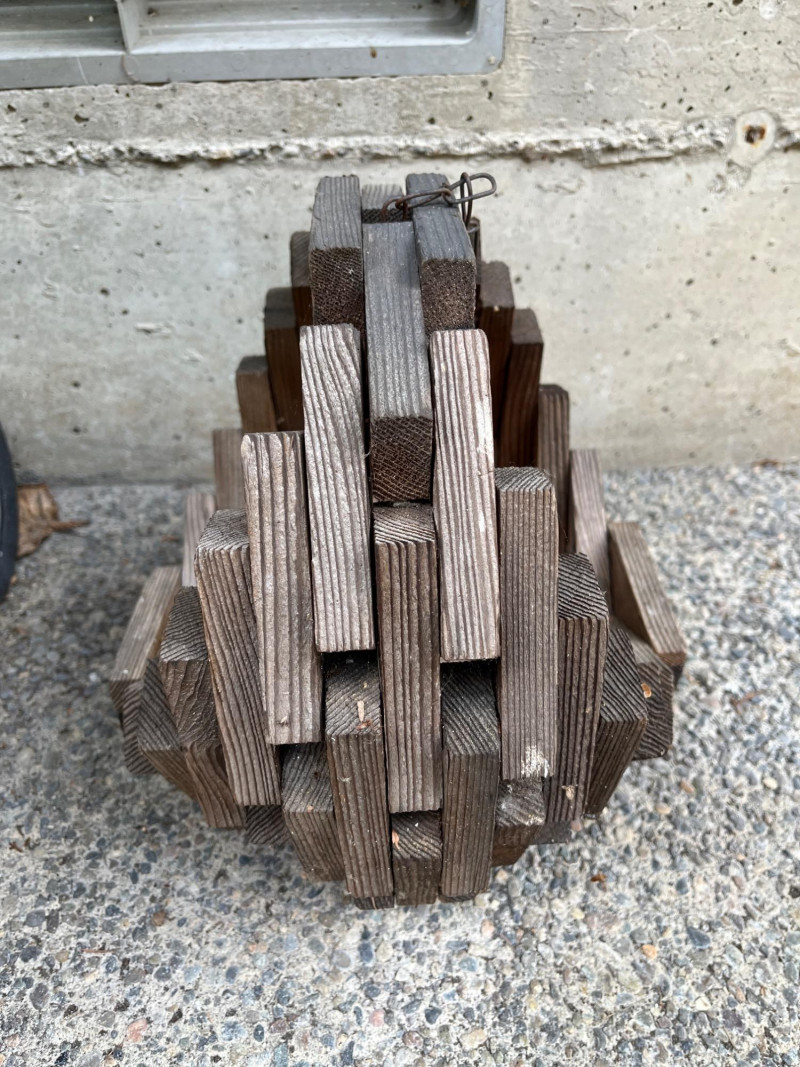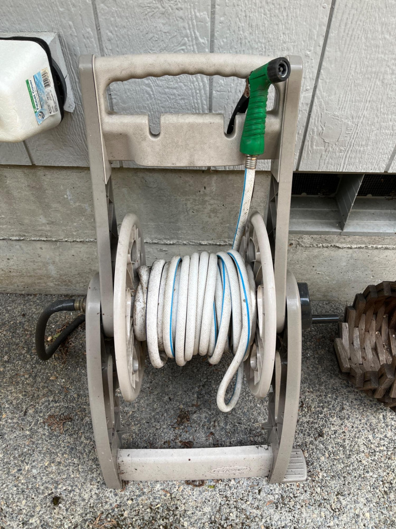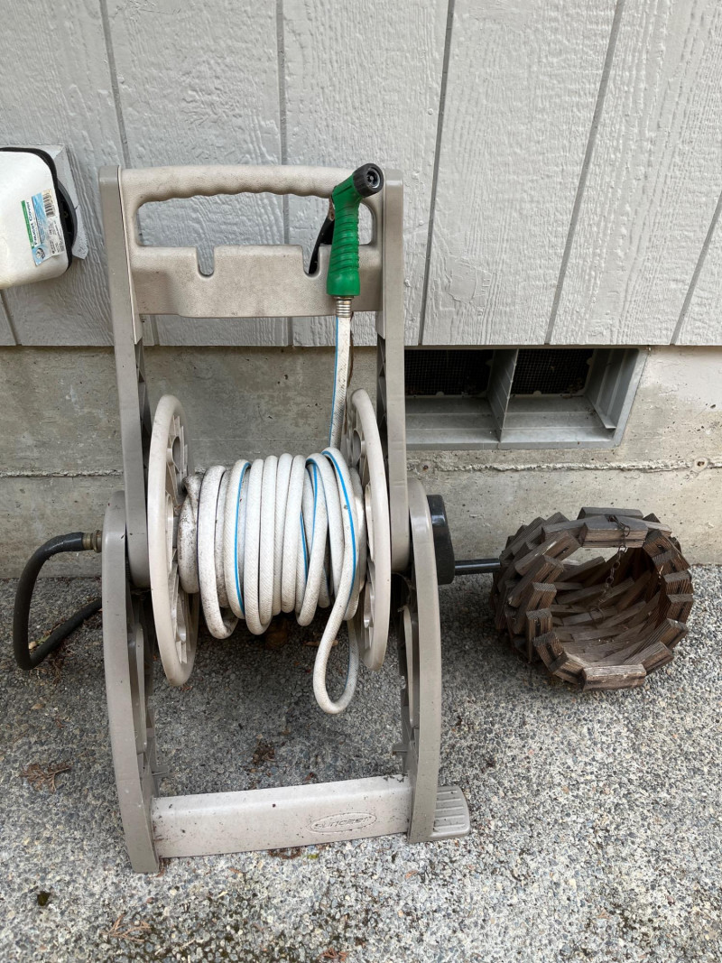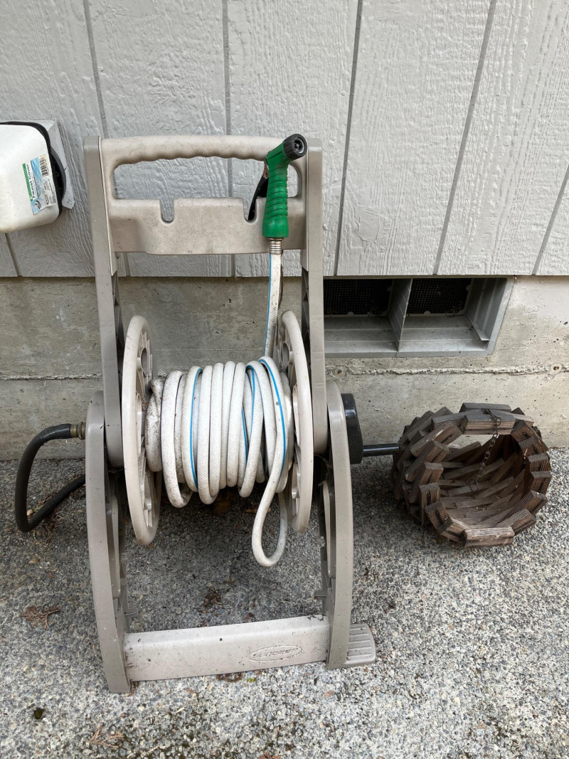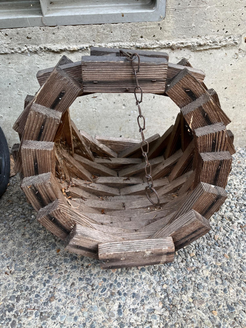 Hose Reel & Vinatge Wood Block Hanging Basket