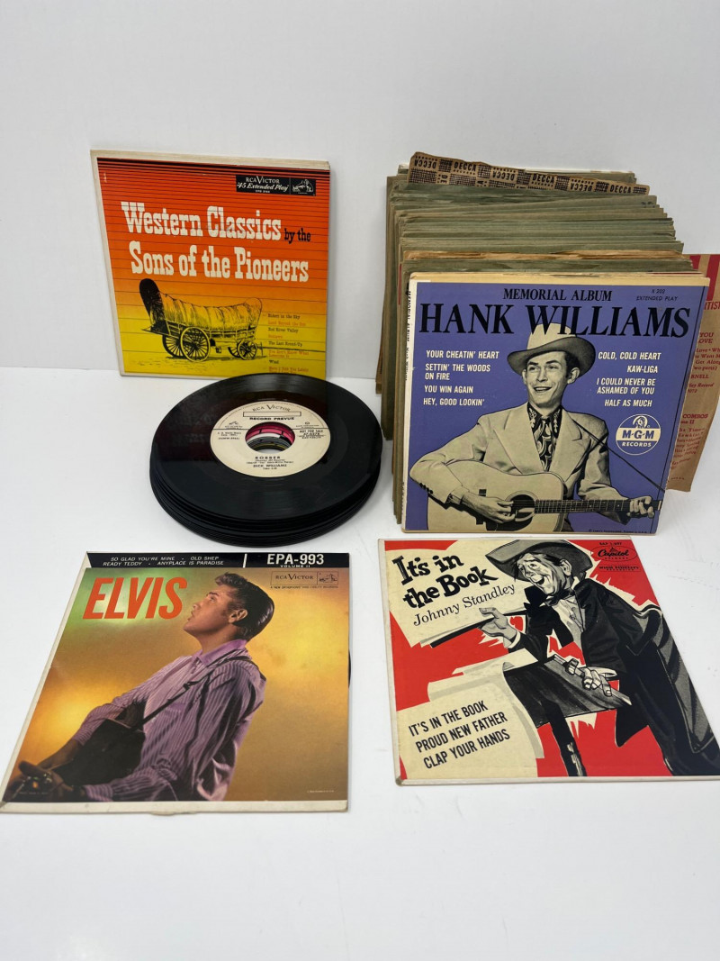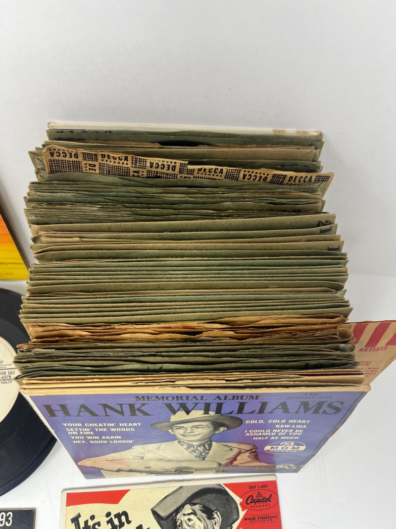 Box of 45RPM Records Most 45's are in plain sleeves 50 Plus In Lot